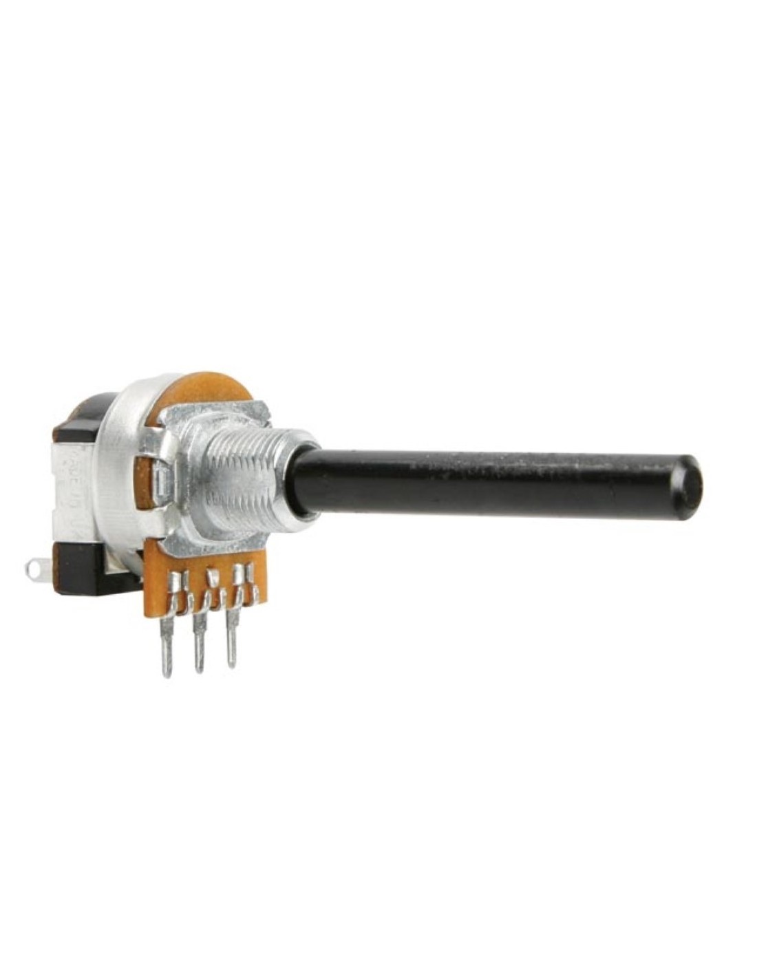 Potenciómetros giratorios de 20mm con capa de carbón para montar en CI. Caja metálica y eje de plástico (Ã 6mm). Interruptor unipolar opcional (1A - 24VDC / 0.3A - 250VAC).
