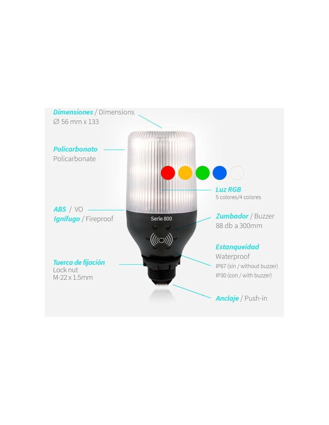 5 colores (Rojo, Ambar, Verde, Azul, Blanco)