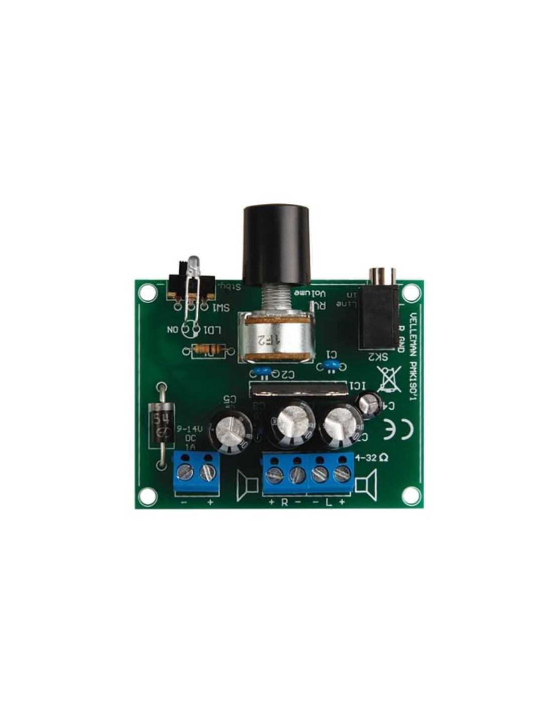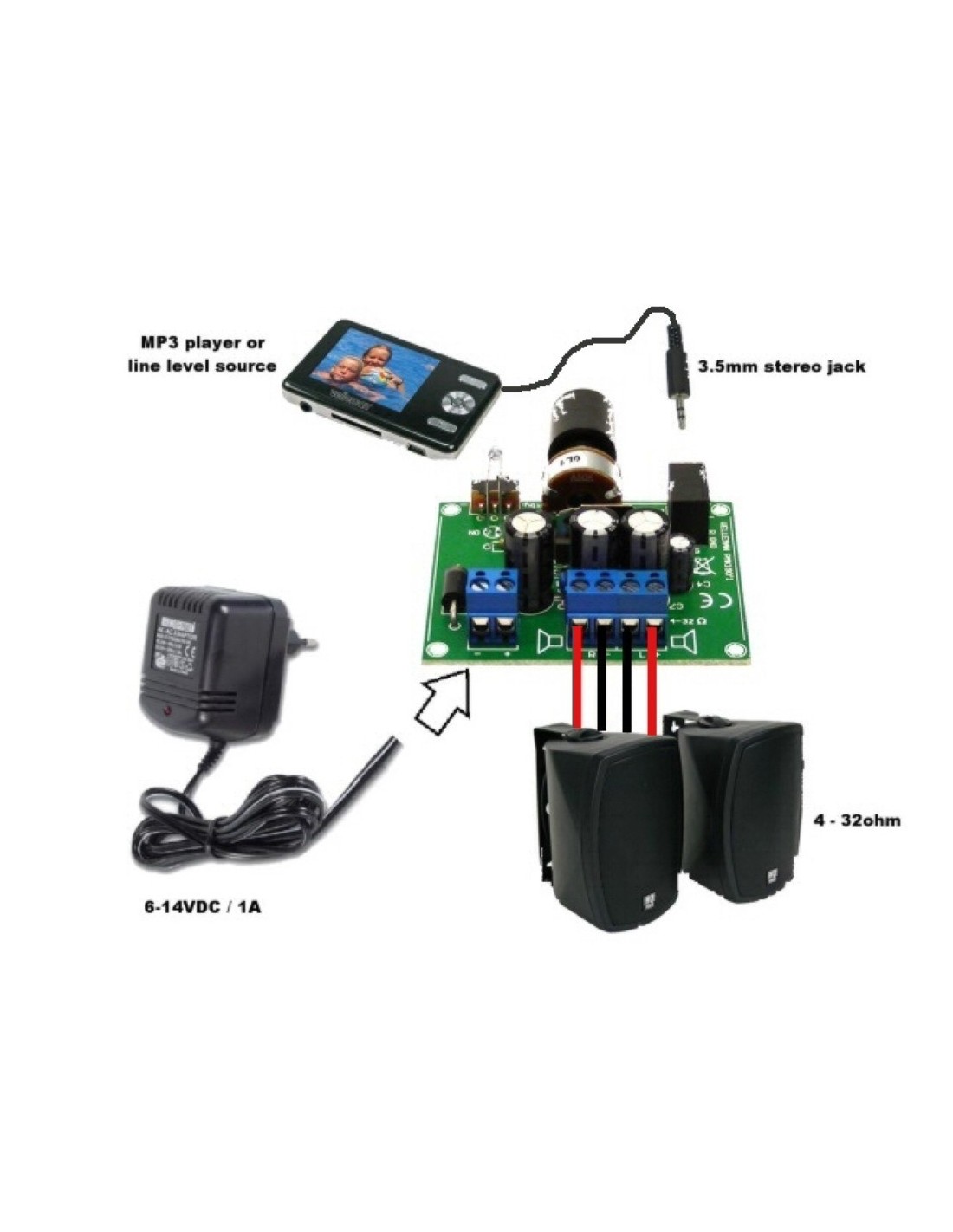 Amplio sonido, distorsión mínima! Este amplificador compacto para un reproductor de MP3 presenta una entrada de conector estéreo de 3.5 mm, un interruptor de activación/apagado, un control de volumen y un indicador de LED azul.