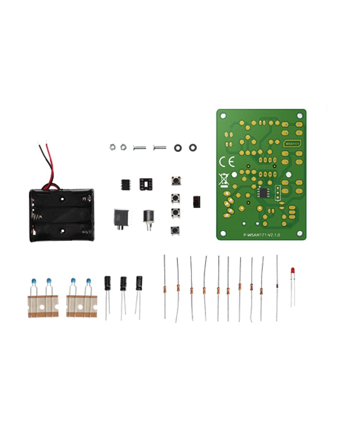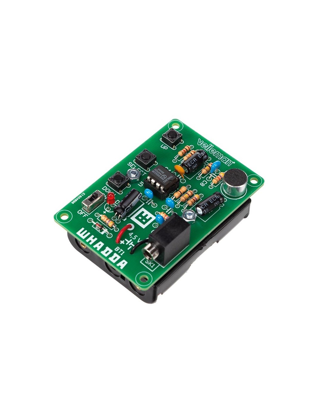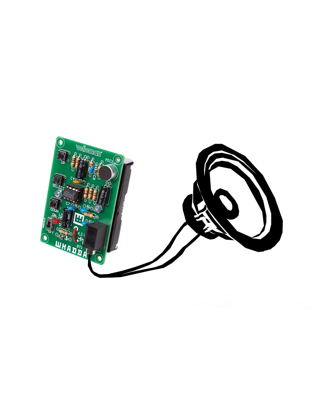 Este genial minikit cuenta con un interruptor de encendido/apagado, un micrófono incorporado y tiene una toma de teléfono estéreo de 3,5 mm. Lo único adicional que necesitará para producir sonido es un altavoz amplificado con un cable auxiliar de 3,5 mm. Inserte 3 pilas AA y ¡listo!