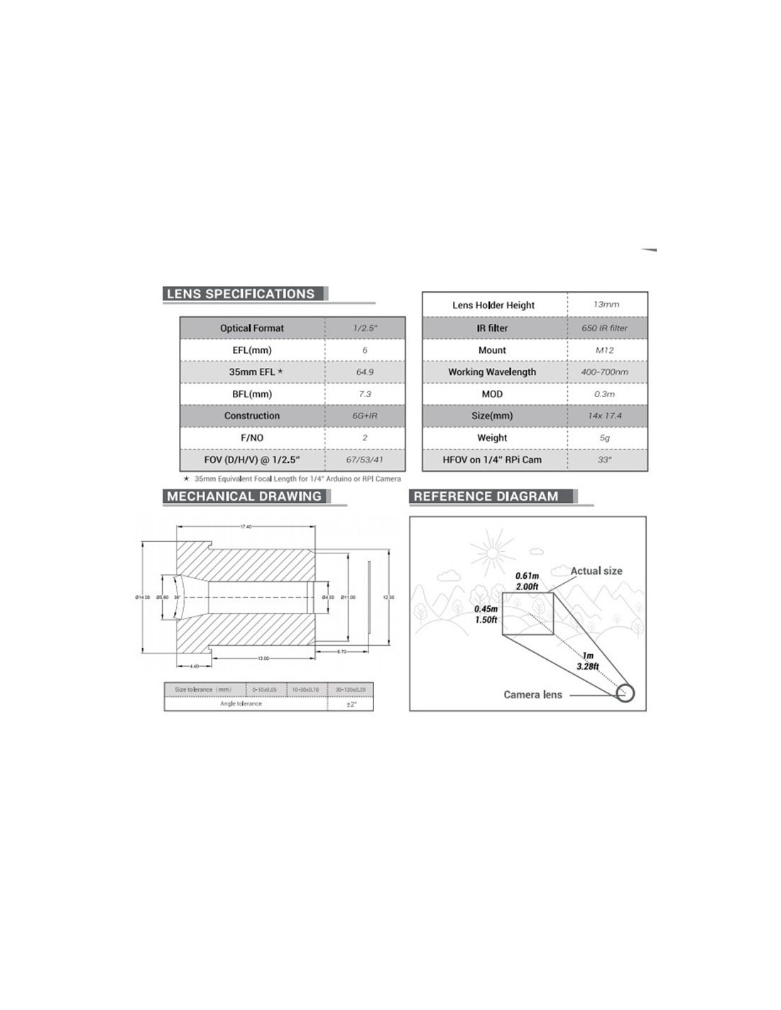 - FOV on 1/2.5” sensor(D/H/V): 67°/53°/41°