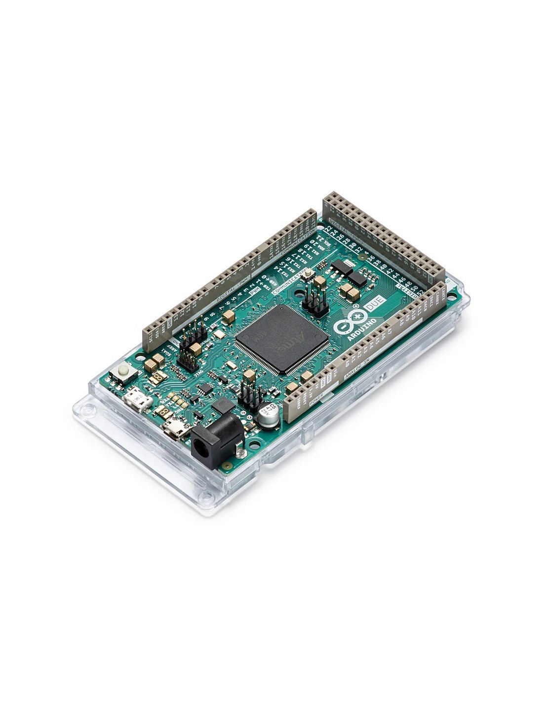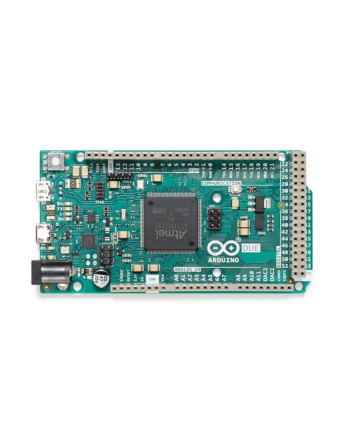 Arduino Due es una placa de microcontrolador basada en la CPU Atmel SAM3X8E ARM Cortex-M3 . Es la primera placa Arduino basada en un microcontrolador de núcleo ARM de 32 bits. Tiene 54 pines de entrada/salida digitales (de los cuales 12 se pueden usar como salidas PWM), 12 entradas analógicas, 4 UART (puertos serie de hardware), un reloj de 84 MHz, una conexión compatible con USB OTG, 2 DAC (digital a analógico), 2 TWI, un conector de alimentación, un conector SPI, un conector JTAG, un botón de reinicio y un botón de borrado.