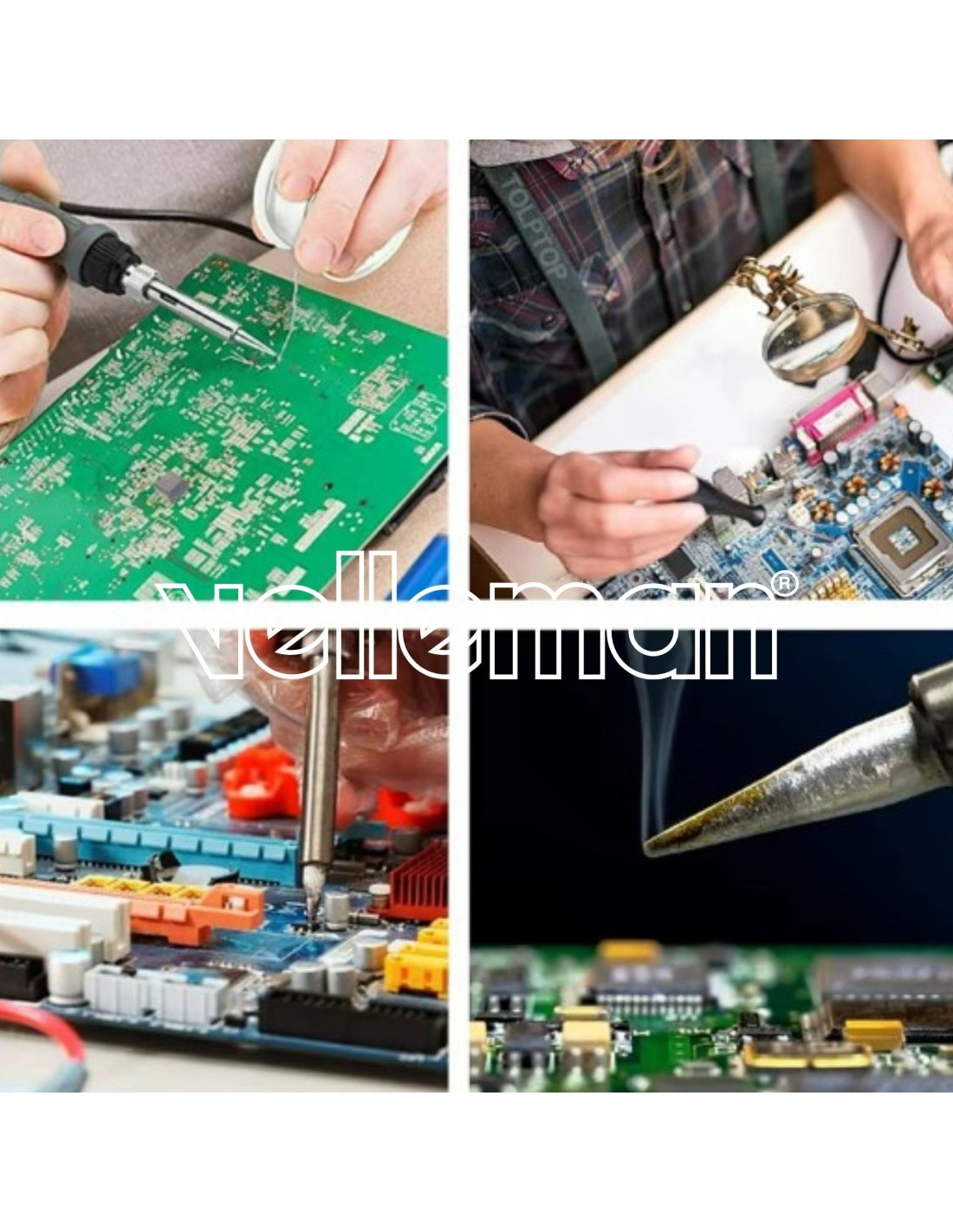 + Mango ergonómico: El agarre antideslizante y resistente al calor asegura un trabajo cómodo y sin fatiga, incluso en sesiones de soldadura prolongadas. + Funcionalidad 2 en 1: Alterna entre el soldador para trabajos precisos y la pistola de aire caliente para desoldar sin contacto, ideal para componentes SMD sensibles y áreas de difícil acceso. + Para profesionales y aficionados: Tanto si eres un técnico en reparación electrónica como un entusiasta del DIY, esta estación de soldadura ofrece una solución confiable para todos los niveles de habilidad. + Aplicaciones versátiles: Perfecta para componentes SMD, reparación de PCBs, cables de teléfono, tubos termorretráctiles, secado, eliminación de adhesivos y más, convirtiéndola en una herramienta esencial para cualquier espacio de trabajo en electrónica. Especificaciones
