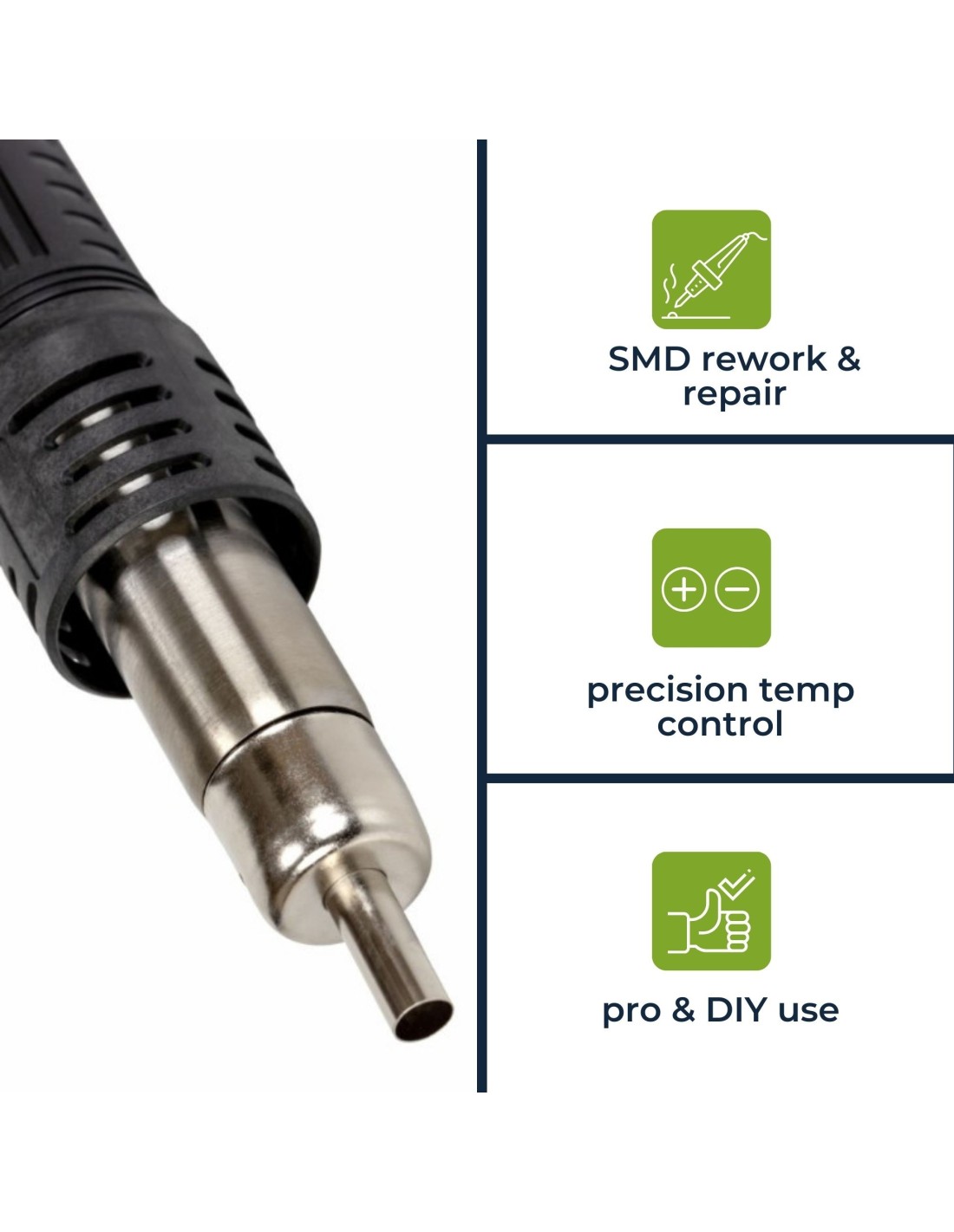 + Control de temperatura preciso: El sistema controlado por microprocesador te permite ajustar la temperatura exacta tanto del soldador como de la pistola de aire caliente, protegiendo componentes electrónicos delicados.