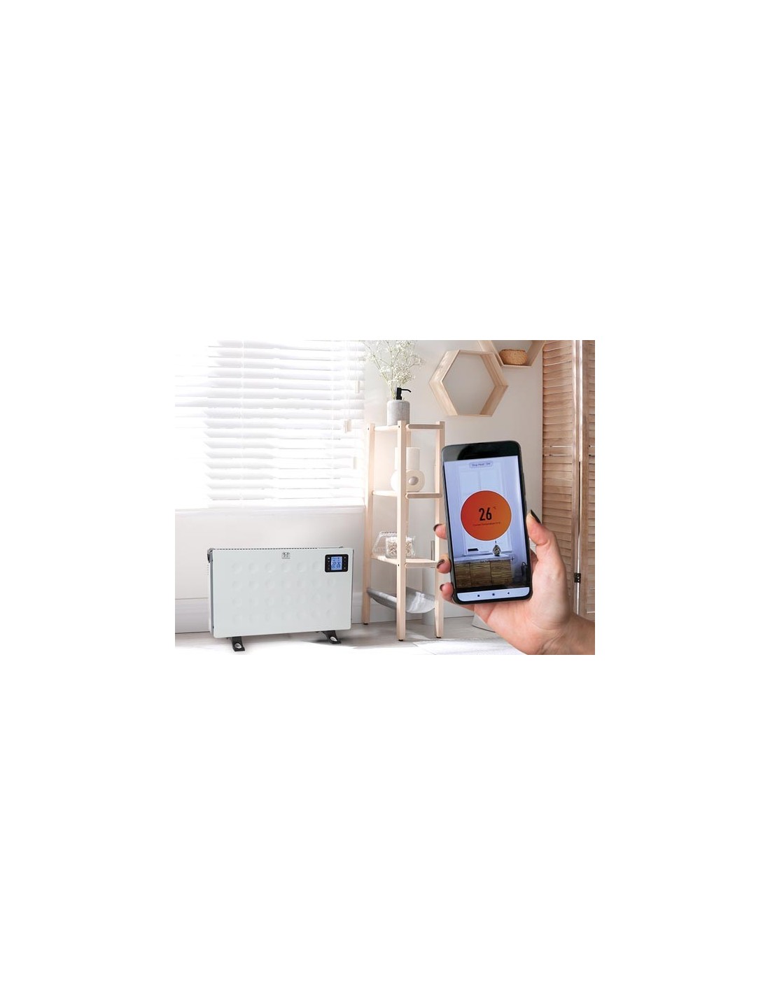 Este convector de Perel es ideal para utilizarlo como calefacción ocasional o complementaria. Se puede controlar con facilidad desde el smartphone a través de la App Tuya o con los botones del propio aparato. El aparato tiene una potencia de 2.000 W y lleva 3 posiciones de calentamiento, un termostato y un temporizador programable 24h. Gracias a la protección contra un posible sobrecalentamiento, el aparato se desactivará inmediatamente en caso de un exceso de calor.