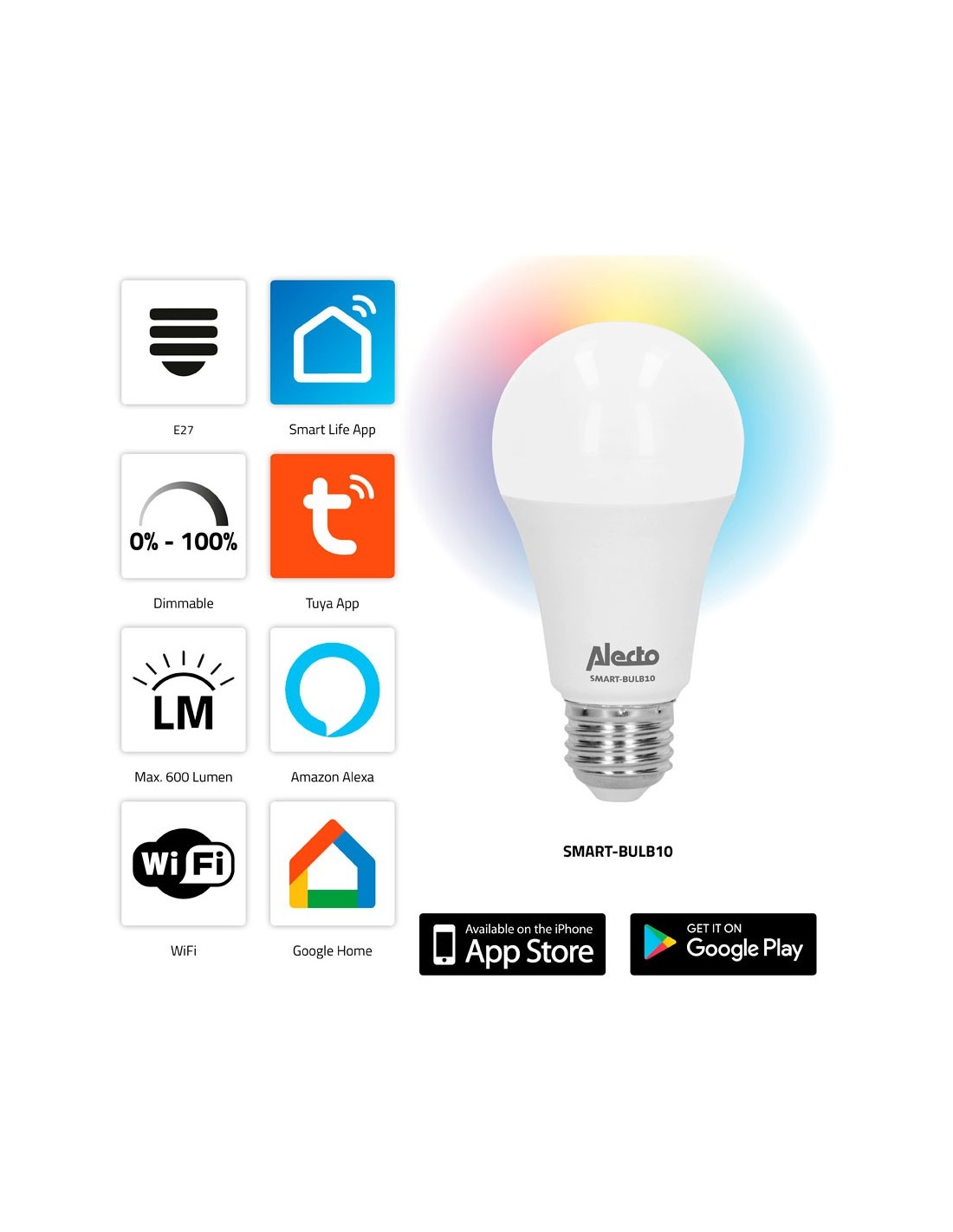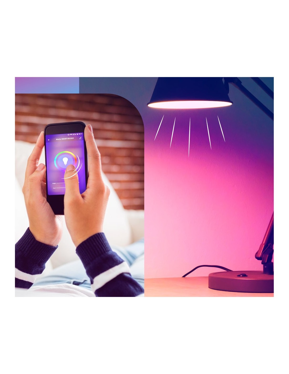 • Funciona con wifi, puede conectarse al router de la red doméstica • Luz blanca (2700K) y todos los colores programables mediante aplicación • Lámpara led regulable en intensidad • Bajo consumo energético: etiqueta energética A+ • Hasta 35.000 horas de funcionamiento • Casquillo E27 • No requiere bridge/gateway • Compatible con sistemas de domótica • Funciona con Tuya • Controle todos los productos Alecto Smart Life con una sola aplicación • Aplicación Smart Life gratuita (Android e iOS) • Control por voz con Amazon Alexa y Google Home • Compatible con IFTTT