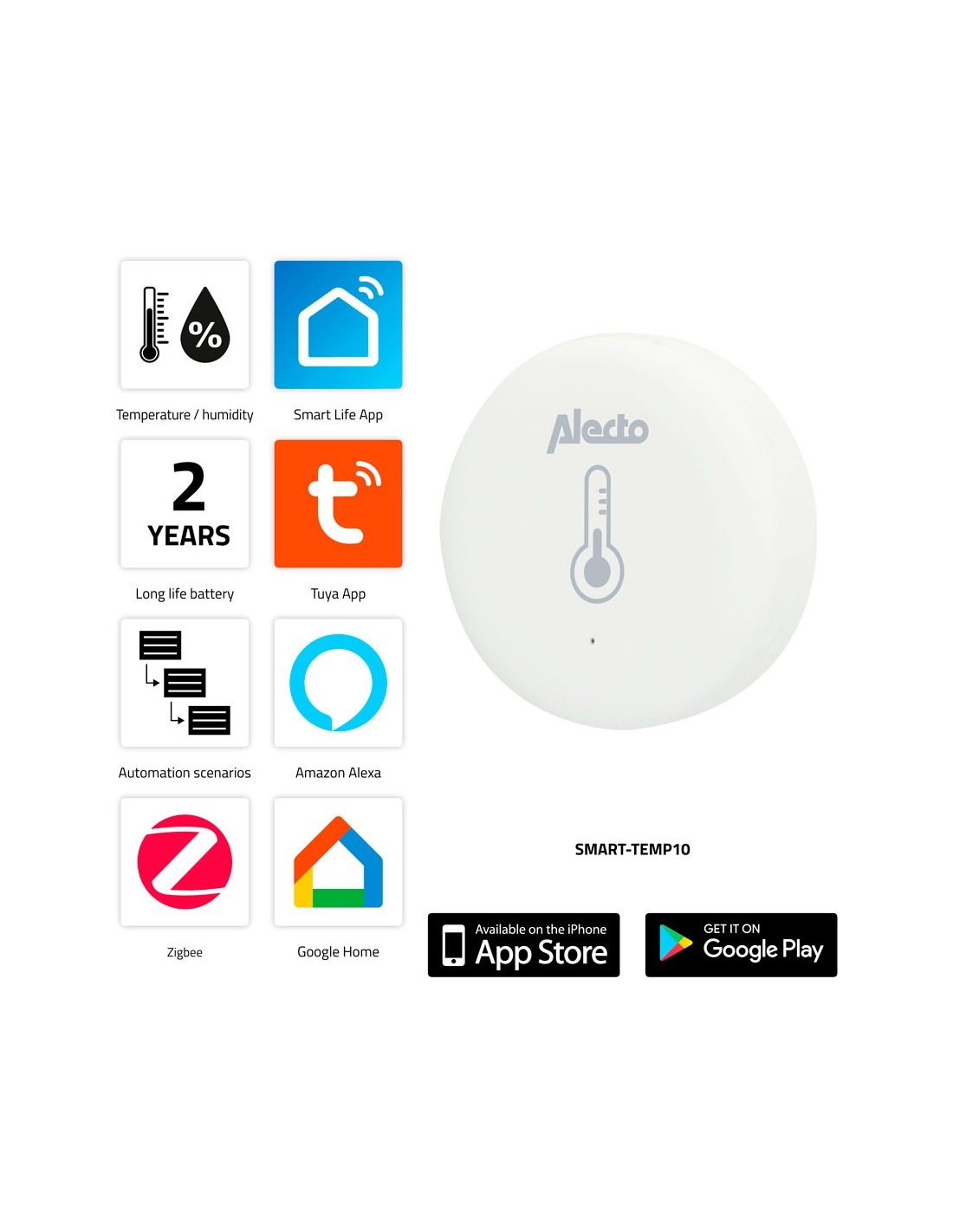 Conozca la temperatura de una habitación o estancia de su hogar y programe reacciones a esas circunstacias creando automatismos o escenas domóticas junto con otros dispositivos inteligentes conectados con las aplicaciones Tuya App, Smart Life App, Amazon Alexa, Google Home, IFTTT con este pequeño sensor Zigbee.