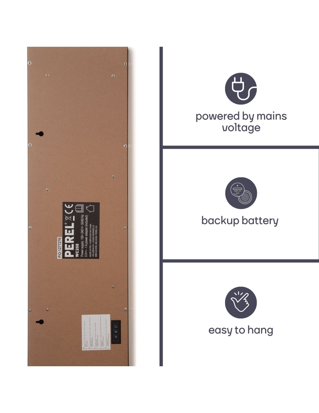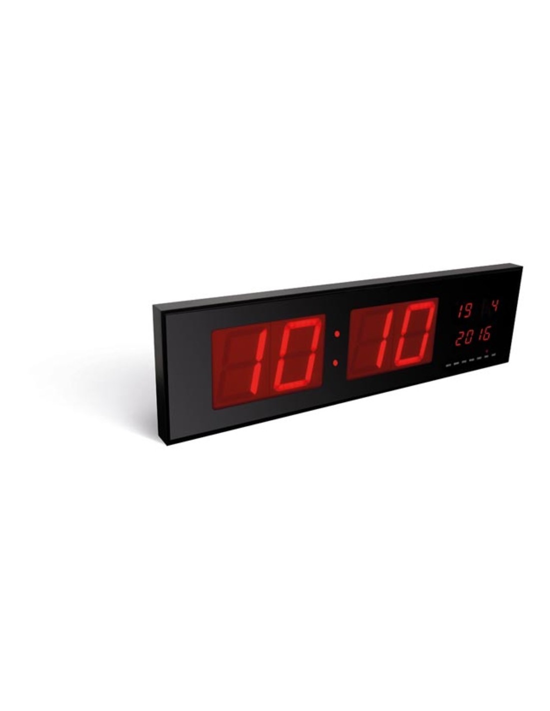 Este reloj moderno en formato de 24 horas tiene una caja negra y una gran pantalla digital que muestra la fecha, la hora, la temperatura y la humedad. Con la gran pantalla digital con LED rojo, el tiempo es claramente legible a la luz del sol y en la oscuridad. El reloj encontrará su lugar no solo en su oficina, cocina o comedor, sino también en la oficina, entrada, sala de espera o clase de clase. Gracias al sistema de fijación central y universal, puede fijar el reloj de la pared a la pared donde colocarlo en una superficie. El reloj funciona en la red eléctrica (adaptador incluido). Batería de rescate: la batería de emergencia le permite mantener en la memoria la fecha y la hora en caso de una falla de energía.
