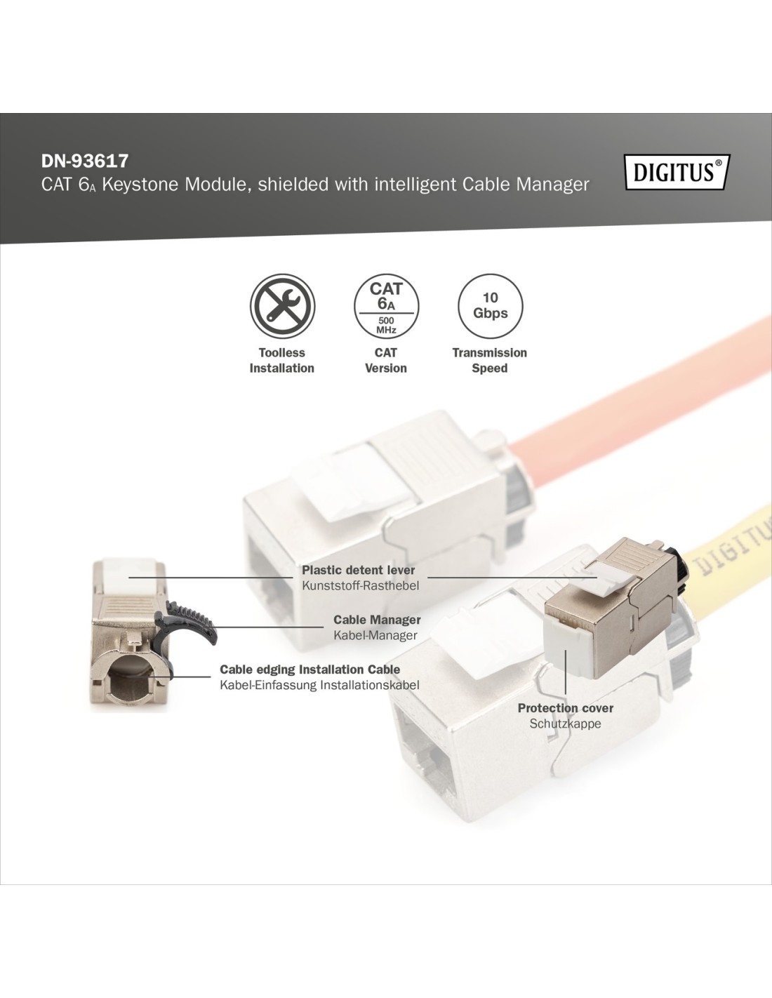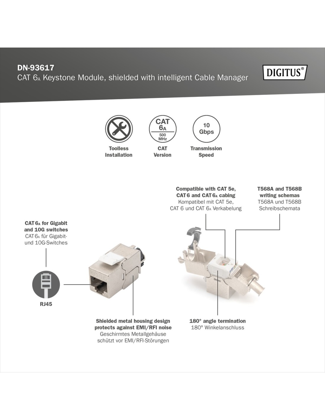 El juego de módulos Keystone CAT 6A apantallados DN-93617 de DIGITUS® convence por sus estándares orientados al futuro y su calidad superior para su red. Los módulos poseen un contacto de apantallamiento de 360° y un organizador de cables inteligente con cierre reutilizable para la descarga de tracción y la fijación del cable. El diseño compacto permite una instalación en serie de 483 mm (19”) 1U. La instalación sin herramientas se realiza mediante regletas IDC, con código de colores según EIA/TIA 568 A y B. Además, con su construcción compacta, el módulo cabe en cajas de conexión modulares de diseño compatible.