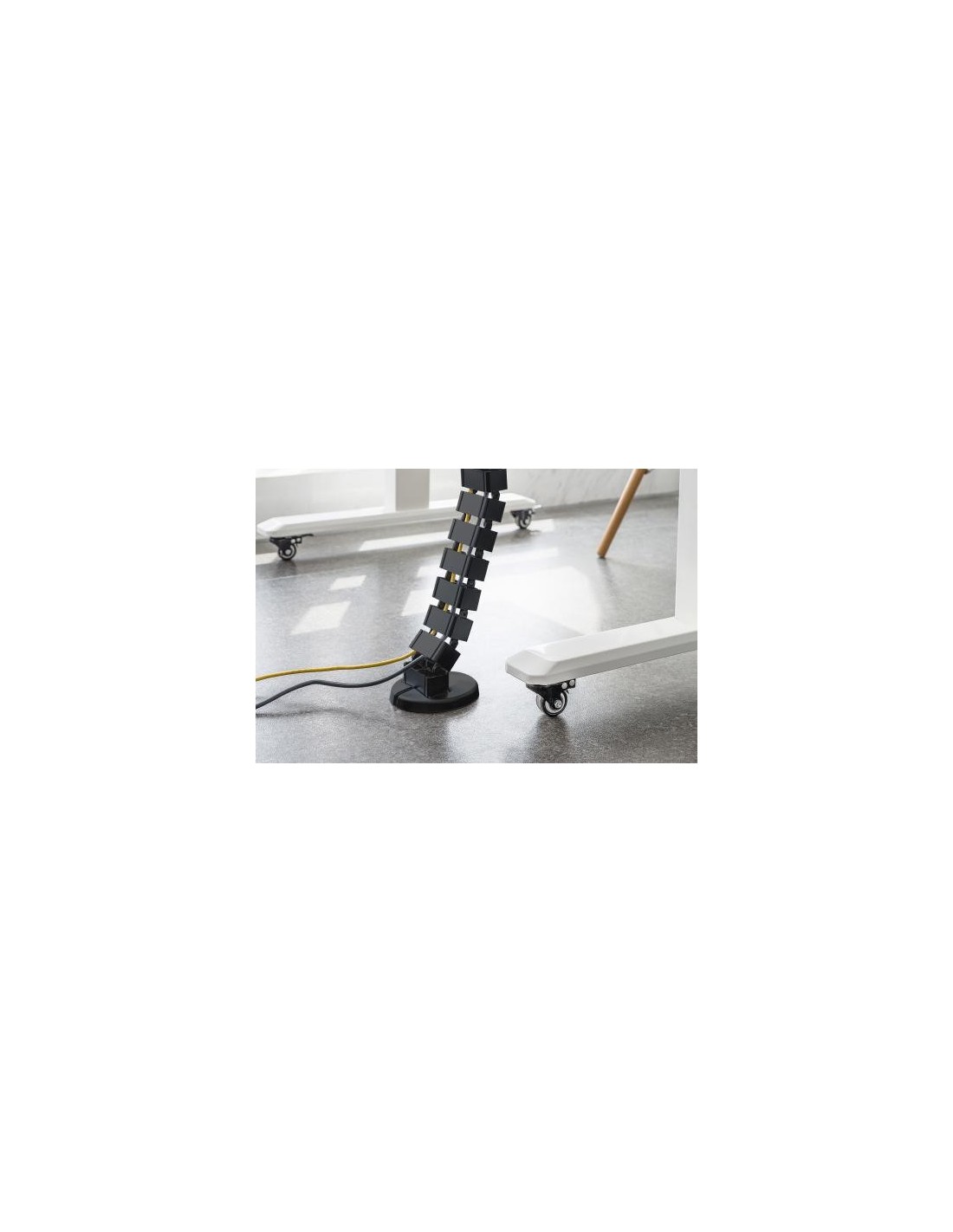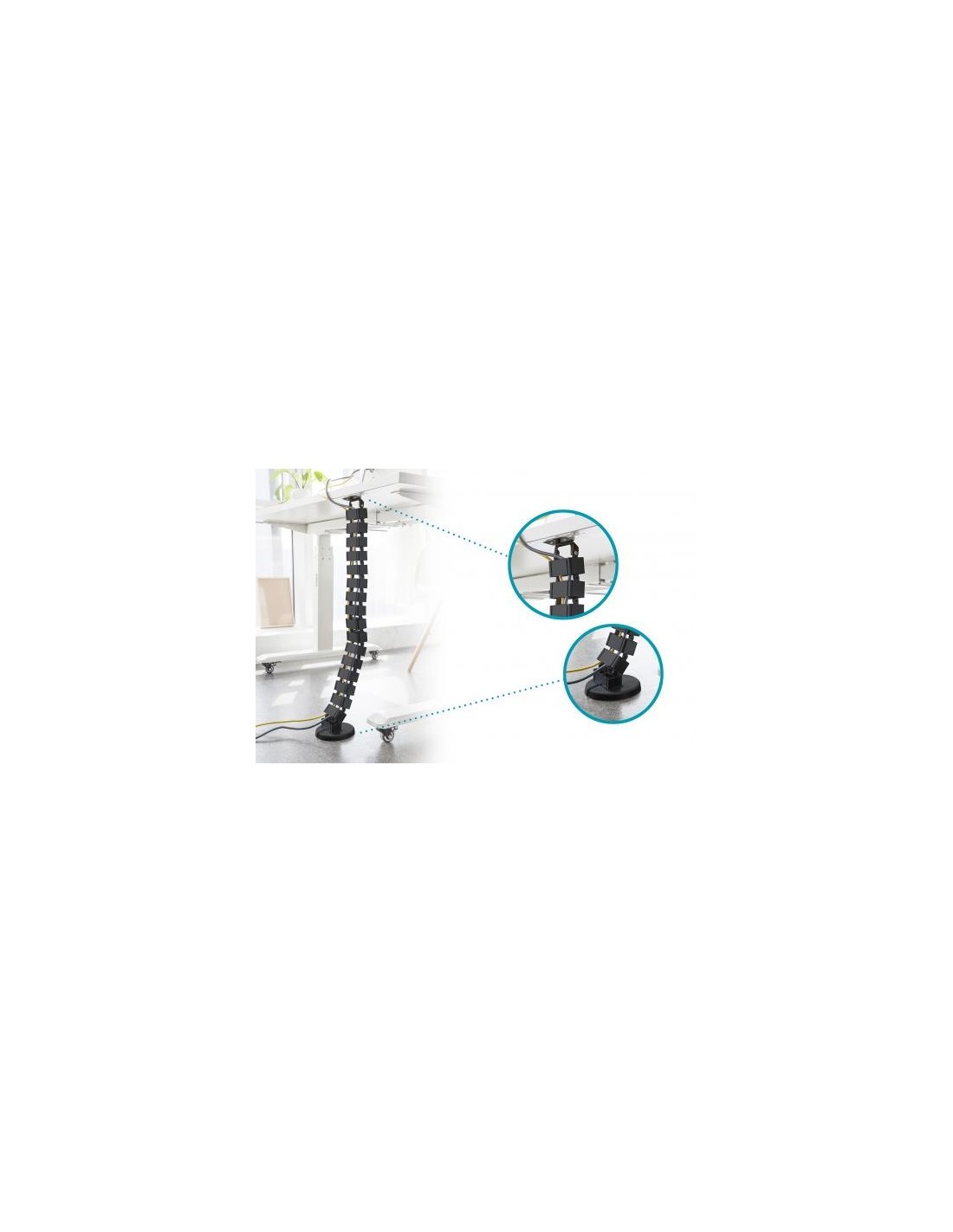 - La columna pasacables es el complemento ideal para ocultar los cables en mesas independientes regulables en altura, que van del suelo al tablero de la mesa