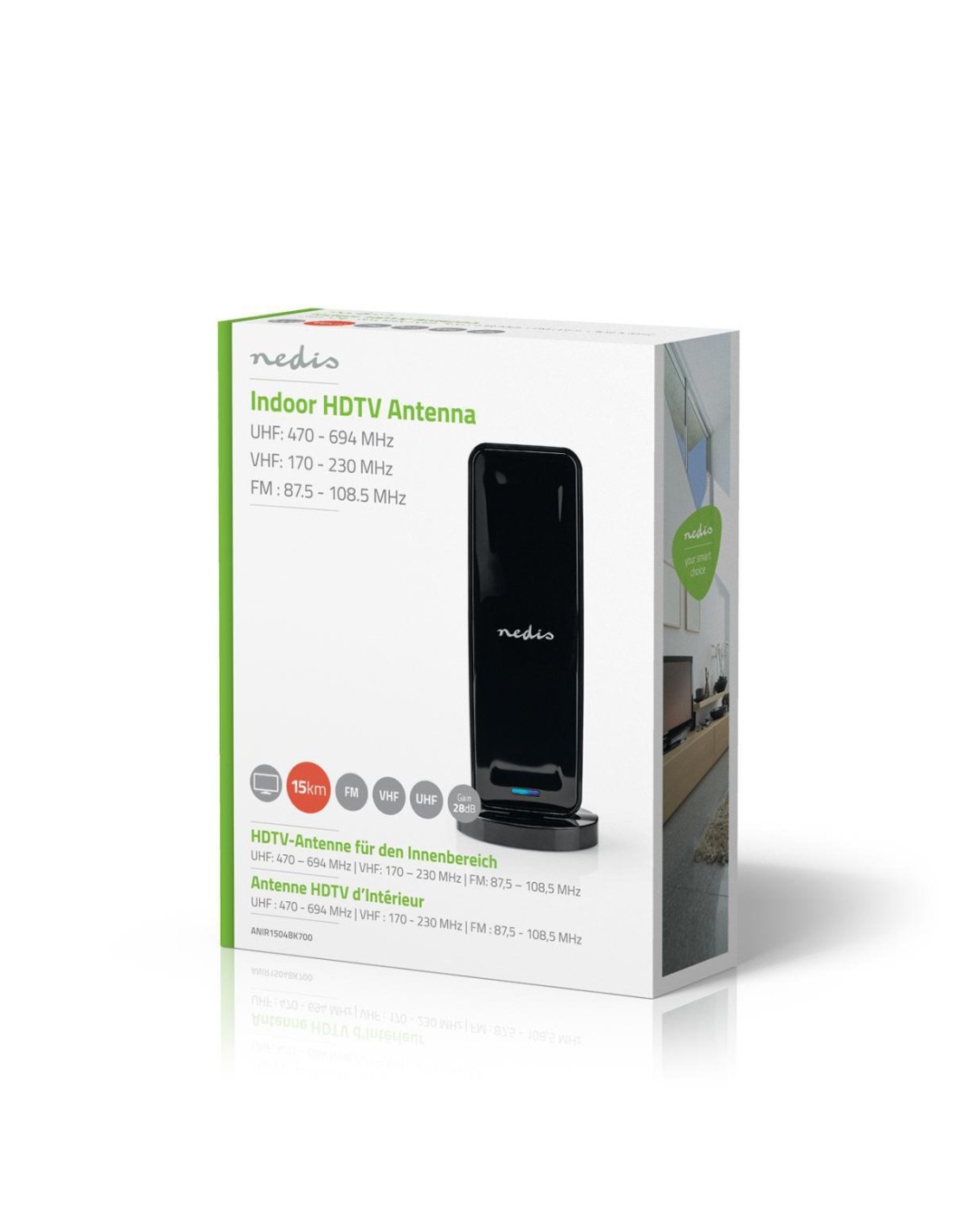 Esta antena para interior Nedis® DVB-T/T2 garantiza una recepción estable de canales analógicos, canales de pago (si está suscrito) y señales de radio FM. La antena cuenta con un diseño compacto y elegante que combina con cualquier interior, sin llamar demasiado la atención.
