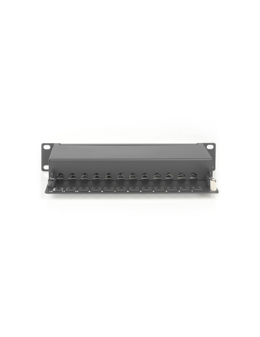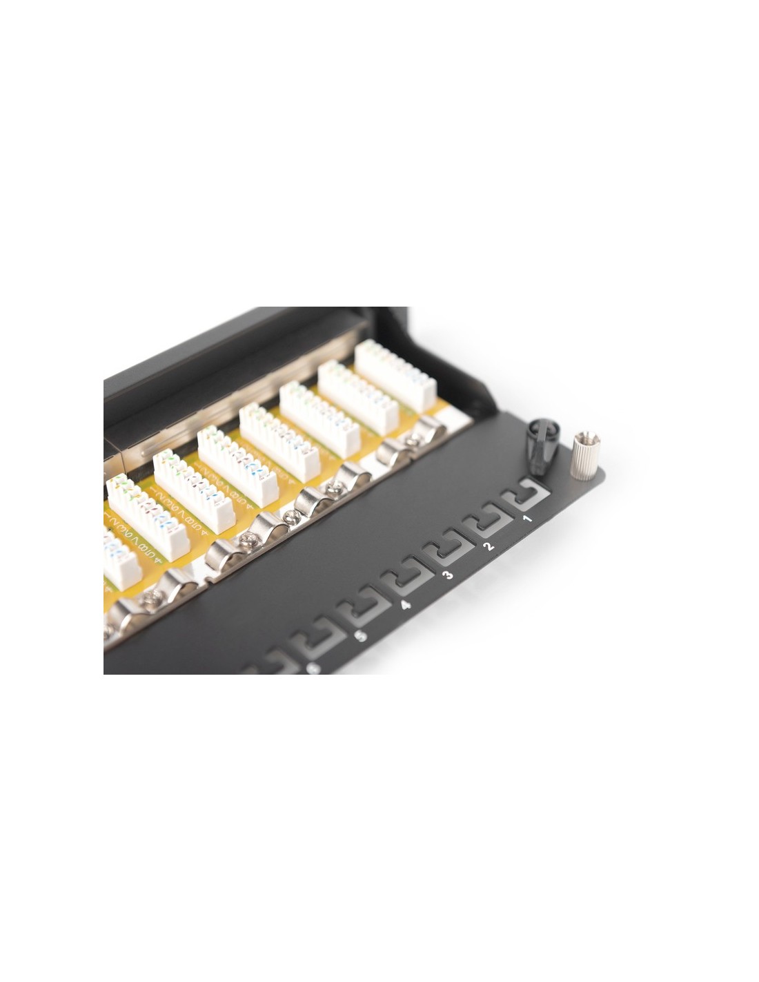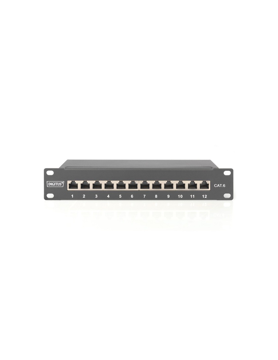 CAT 6, panel de conexión clase E, apantallado, 12 puertos RJ45 8P8C, IDC, 1UA, 254 mm (10"), montaje en rack, negro RAL 9005