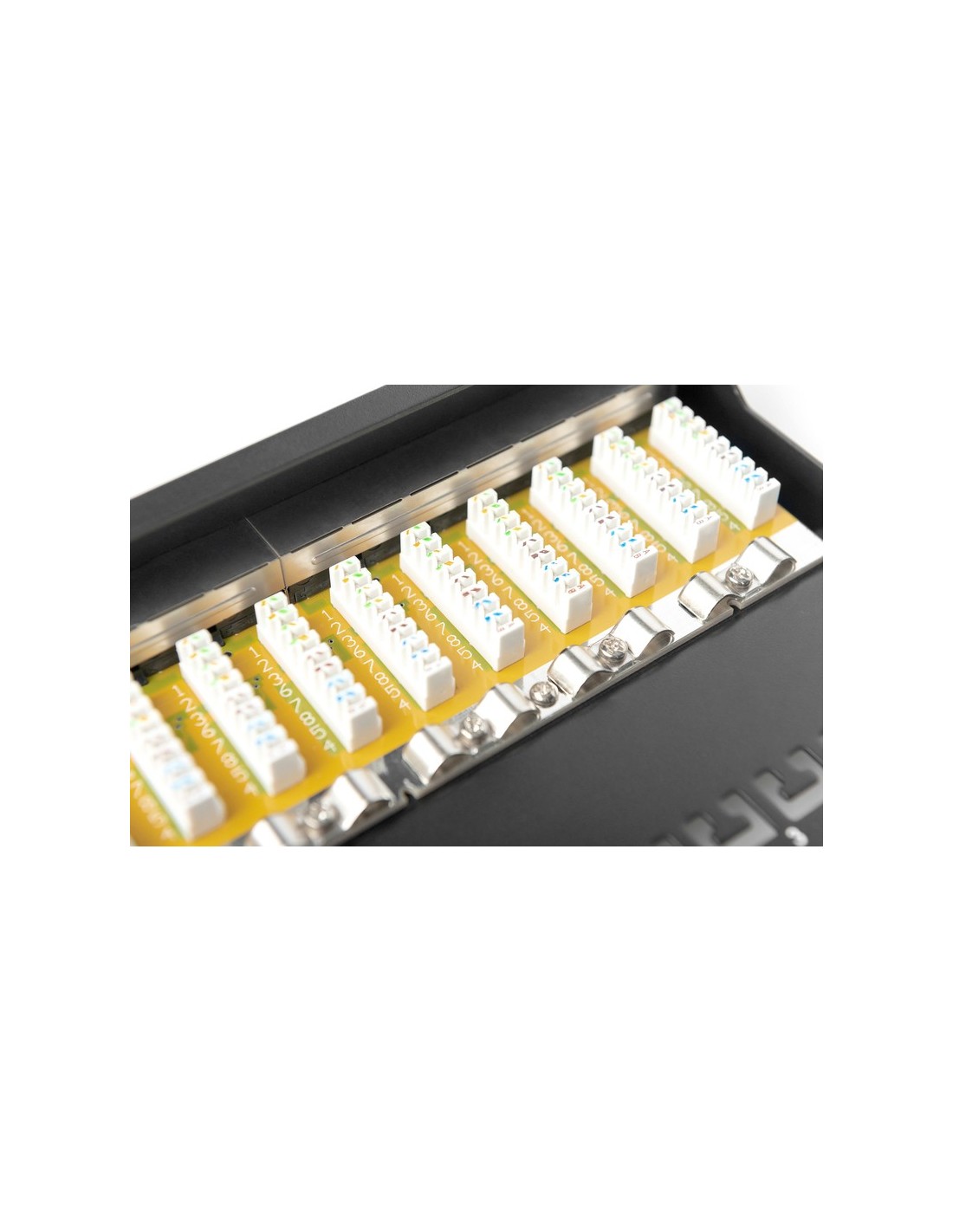 - Una carcasa metálica cerrada con conexión central de puesta a tierra asegura el apantallamiento del panel de conexión de 12 puertos y las regletas IDC para el montaje de los cables de instalación de la red