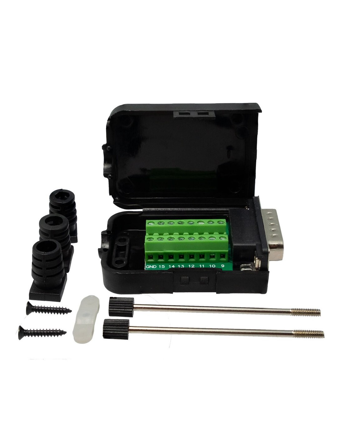 Conector DB15 con terminales, permite hacer la conexión manual de cable y conector. Dispone de 4 tipos diferentes de gomas de sujeción, para cables de diferentes diámetros