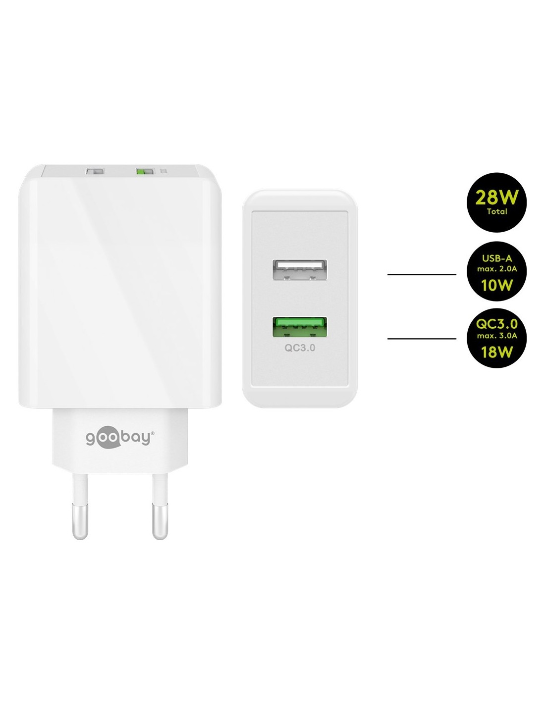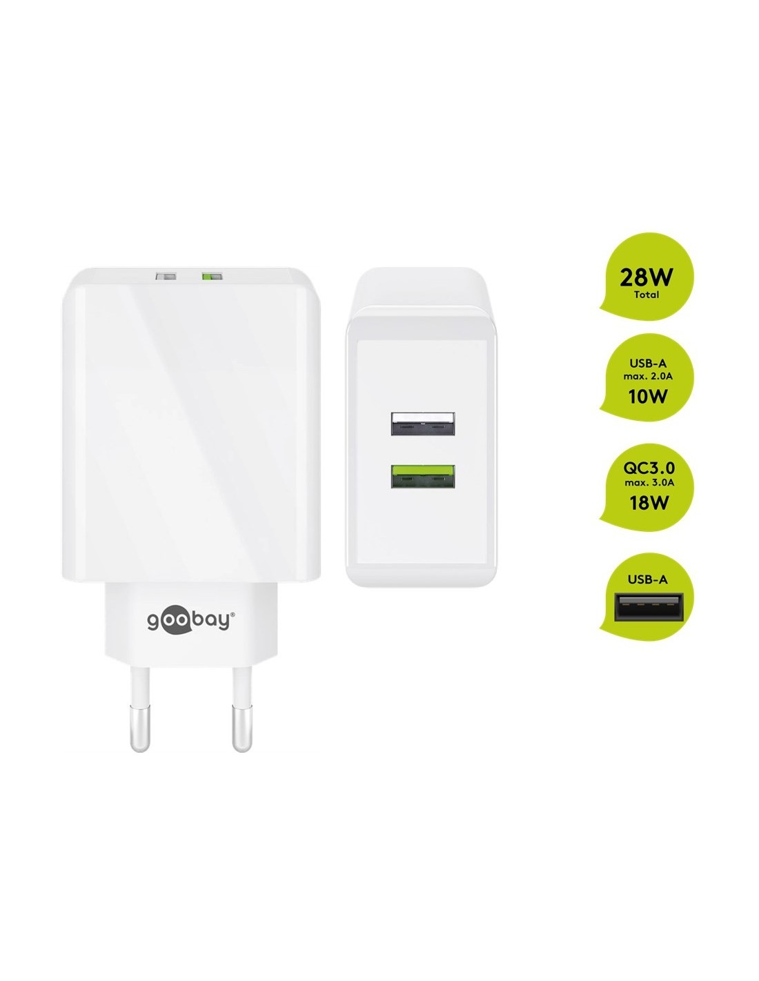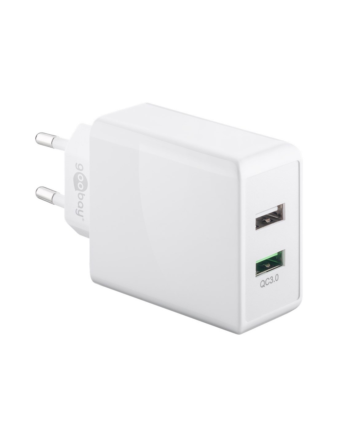 El cargador USB Goobay está equipado con 2 puertos USB-A para cargar hasta 2 dispositivos al mismo tiempo.