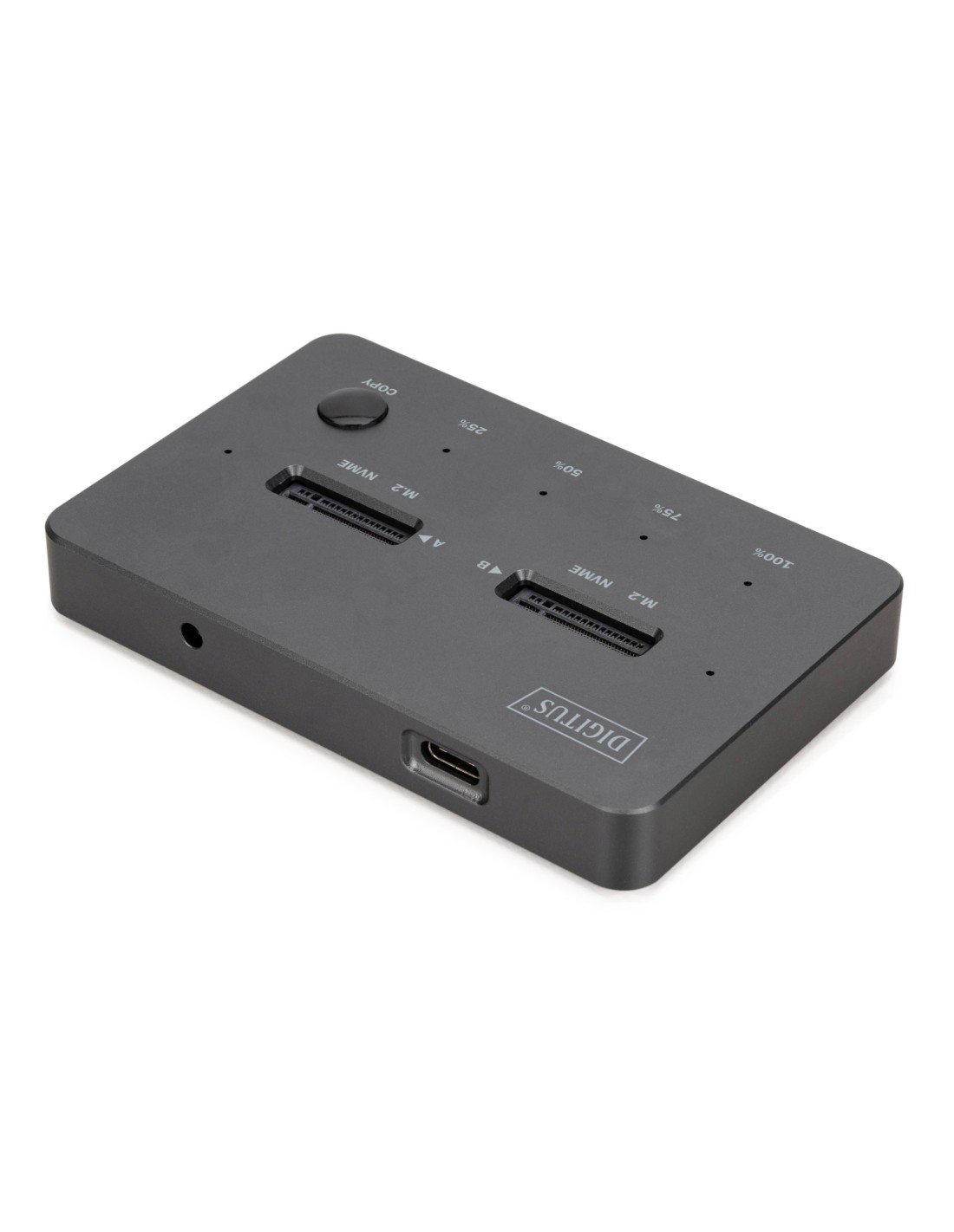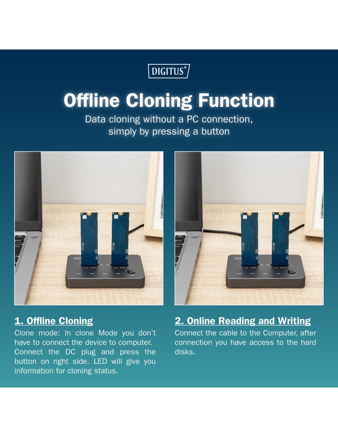 La DIGITUS® Dual NVMe Docking Station DA-71545-1 ofrece una potente solución de almacenamiento para profesionales y entusiastas de la informática. Con espacio para dos SSD M.2 NVMe (hasta 4 TB por ranura), permite transferencias de datos a alta velocidad y una función de clonación offline integrada que permite duplicar fácilmente los soportes de datos con solo pulsar un botón.