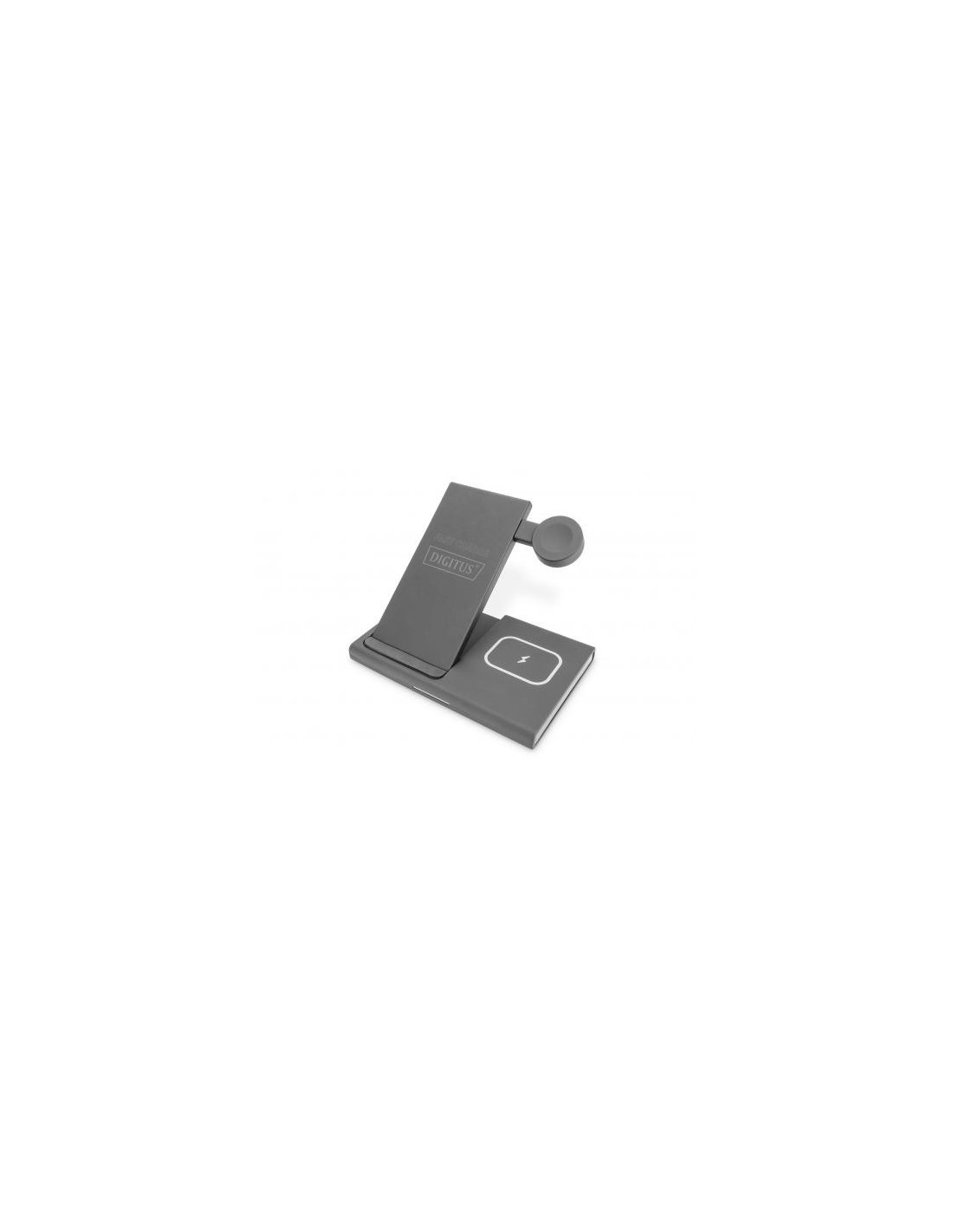 14 días de devoluciónLa estación de carga inalámbrica 3 en 1 de DIGITUS® permite la carga simultánea de un iPhone® u otro smartphone apto para QI, un iWatch®, así como AirPods® que admiten la carga inductiva. La carga tiene lugar de forma inalámbrica mediante inducción. Basta con colocar los dispositivos; la carga se inicia automáticamente. El ángulo de inclinación de la base de carga para el smartphone se puede regular de forma continua. El iWatch® se sujeta en su lugar por medio de imanes y no se necesita la almohadilla de carga original. La superficie de la estación es antideslizante para asegurar que los dispositivos permanezcan en su lugar.