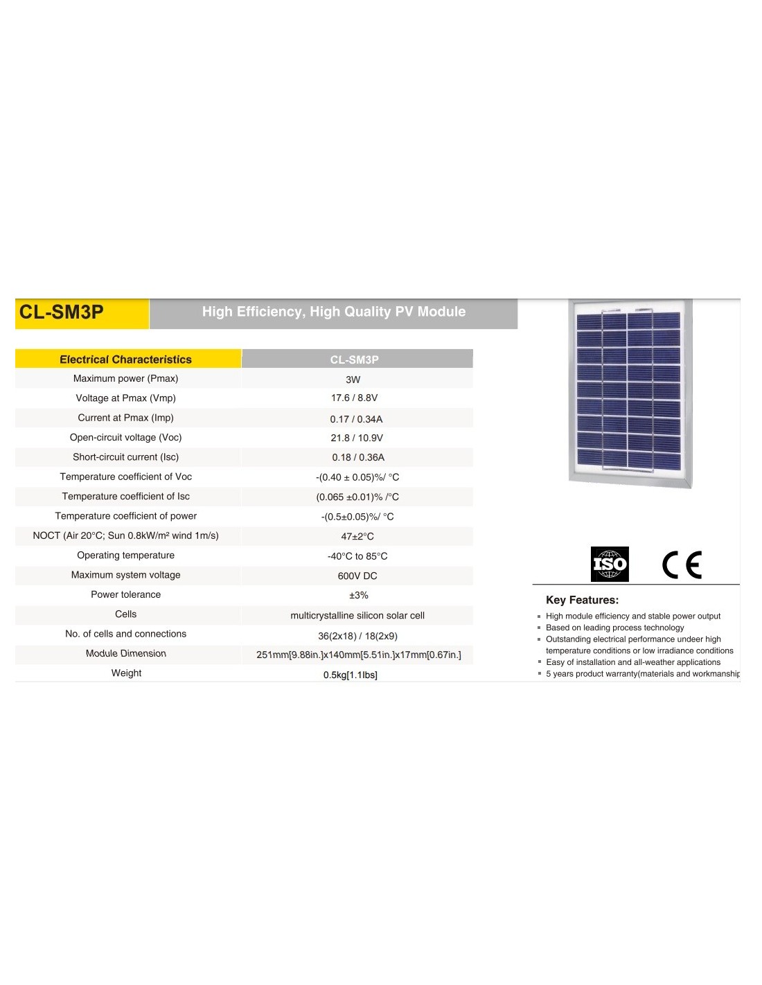 PLACA SOLAR SILICIO POLICRISTALINO 251x140x17mm 3W 12V 170mA