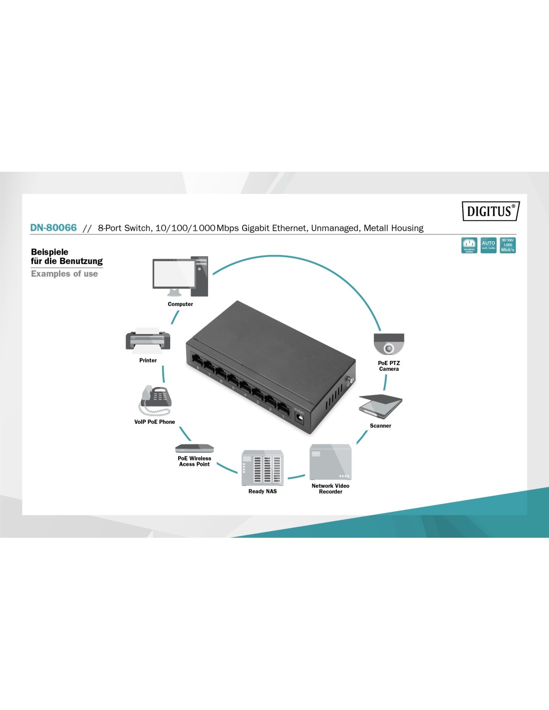 Switch FE de 8 puertos RJ 45 Digitus 8 x 10/100 Mbit/s. Switch Gigabit Ethernet 10/100/1000Mbps de 8 puertos, unmanaged, conexiones Auto-Negotiation RJ45, en todos los puertos RJ-45 se dispone de Auto-Negotiation.