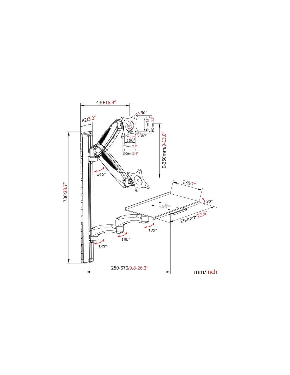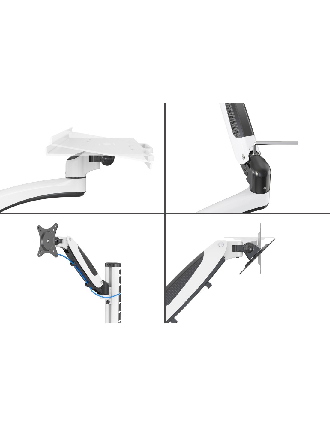 - Brazo de monitor (muelle neumático) - inclinación 45°, orientable en 180°, alojamientos VESA, giratorio en 360°