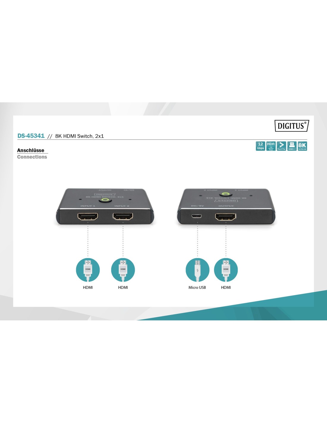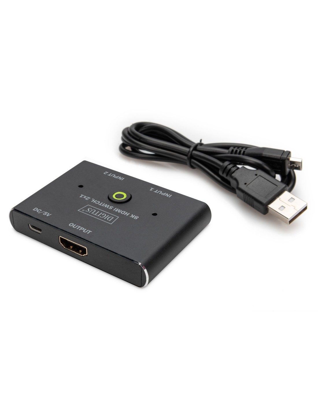 Cambie convenientemente entre dos fuentes de señal HDMI con solo tocar un botón o detección automática, sin la molestia de volver a conectar. Admite resoluciones de hasta 8K/60 Hz. La fuente de alimentación es a través del cable micro USB incluido.