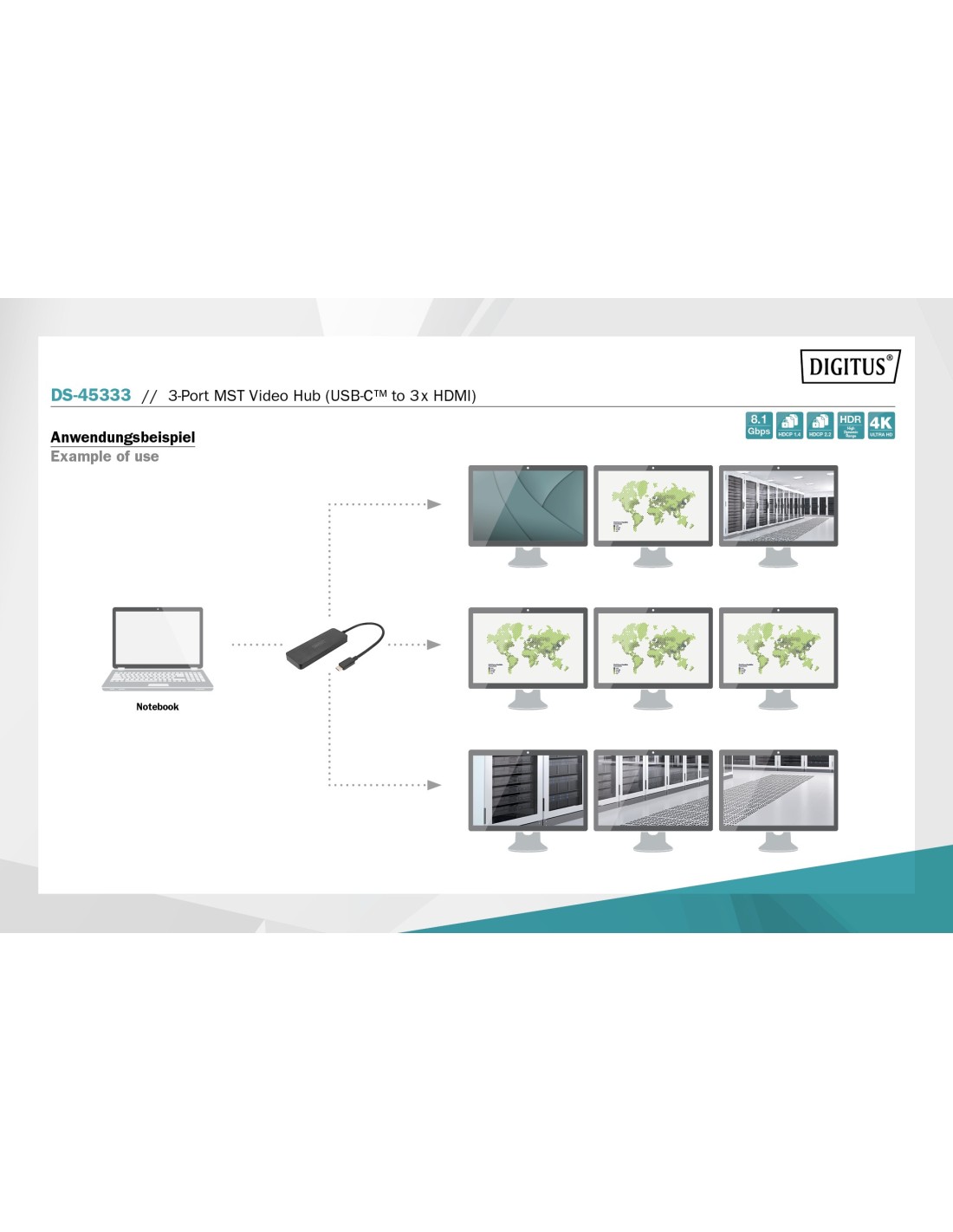 El hub MST DIGITUS® utiliza el Multi Stream Transport (función de DisplayPort™ 1.2) que permite transportar varias señales AV a través de un único cable. Esto hace posible utilizar varios monitores conectados a través de la configuración del hub MST. El hub MST puede distribuir diferentes flujos de vídeo a las tres pantallas conectadas. Por regla general se soportan tres modos de reproducción: Duplicación (1 señal duplicada en 3 pantallas), ampliación (3 señales en 3 pantallas), distribución (1 señal distribuida entre 3 pantallas).