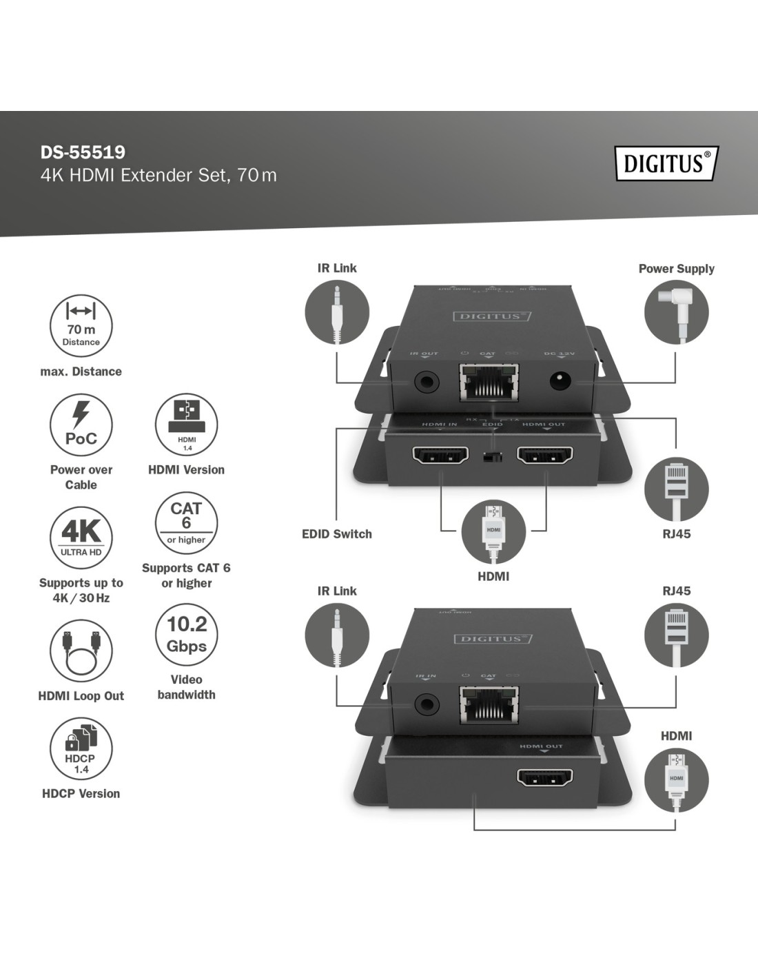 El kit extensor HDMI prolonga señales AV Full HD a una distancia de hasta 70 m; las señales 4K/30 Hz se pueden prolongar hasta una distancia de 40 m a través de un cable de red CAT6 (o superior). La unidad emisora dispone de un HDMI-Loop Out para la conexión de un monitor local. Gracias a PoC (Power over Cable), solo el emisor necesita una alimentación eléctrica. La transmisión IR permite controlar la fuente de señal cómodamente con el control remoto desde el receptor (pantalla de salida). El volumen de prestaciones también comprende una función EDID-Copy de la pantalla de salida en el receptor o en el HDMI-Loop Out; esta se puede seleccionar mediante el conmutador.