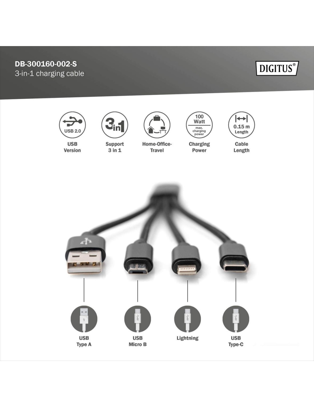 Cable de carga 3 en 1, USB A - Lightning + Micro USB + USB-C