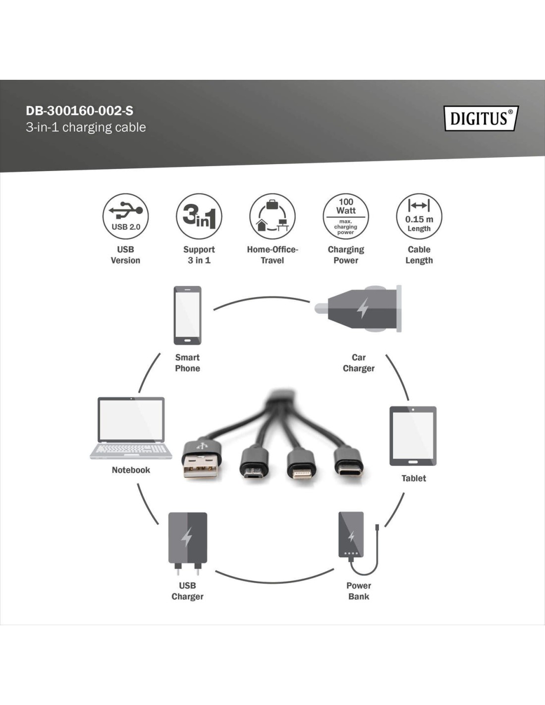Cable de carga múltiple 3 en 1 para conectar dispositivos con conector USB-C, micro-USB u 8 pines a un puerto USB-A