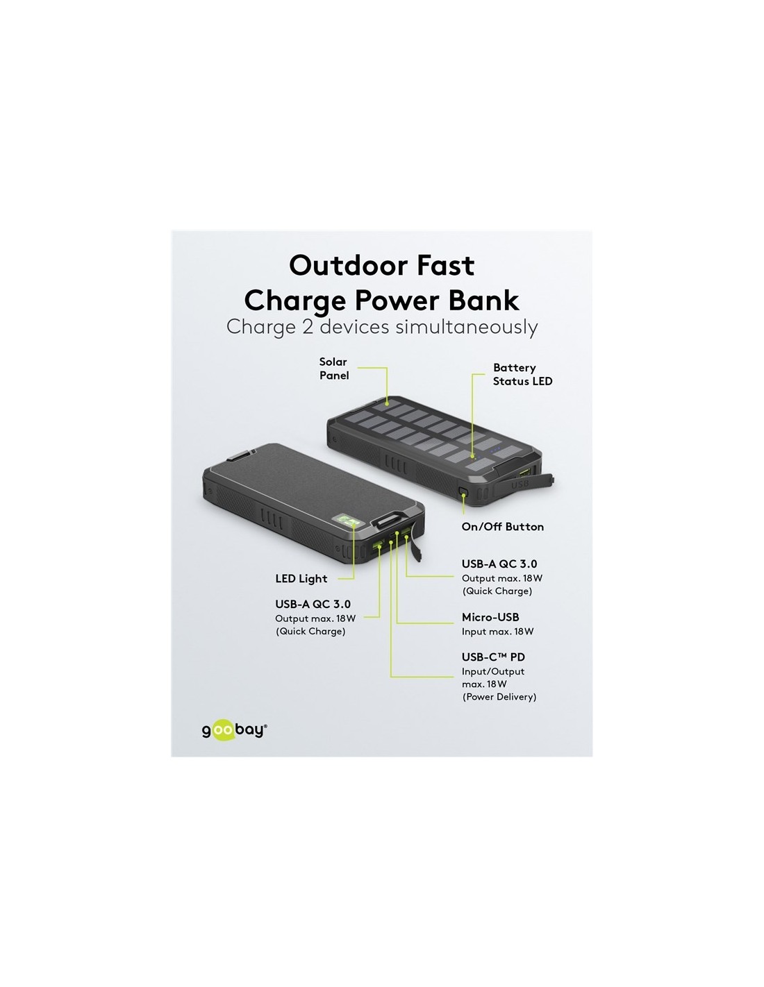 Power bank de carga rápida para exteriores con energía solar 20.000 mAh (USB C™ PD, QC 3.0)