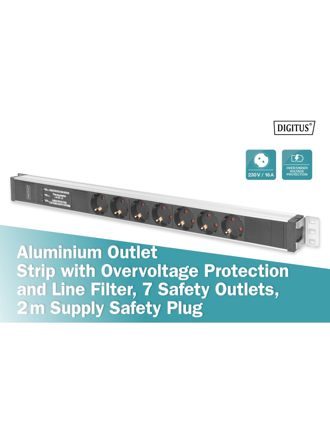 Aluminio PDU, Rack montable, filtro de frecuencia 16A, 4000W, 250VAC 50/60Hz, 7x safety outlet , 2m