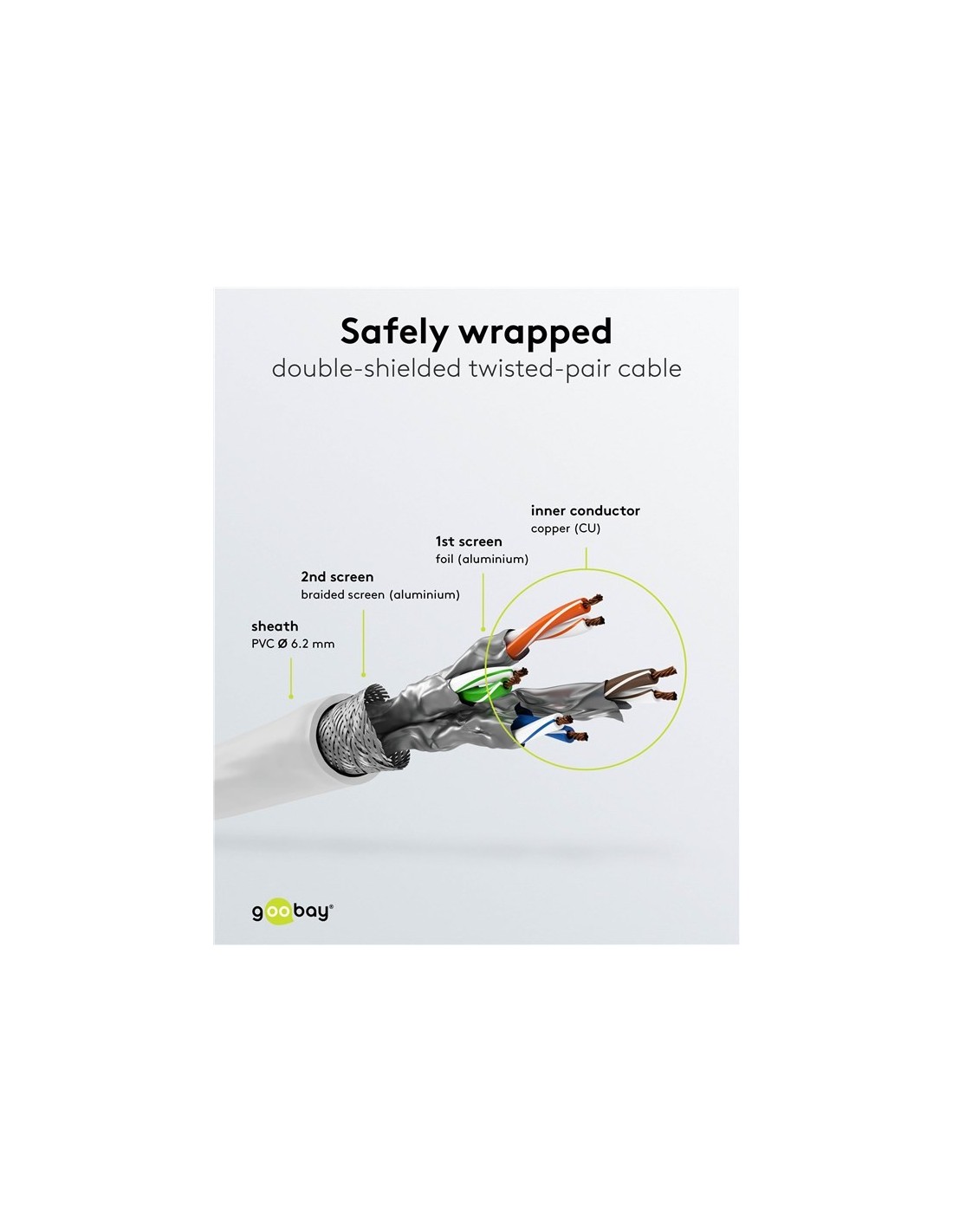 - Blindaje general S/FTP: blindaje de lámina de aluminio para pares de cables individuales (PiMF) y blindaje trenzado de aluminio para la cubierta del cable