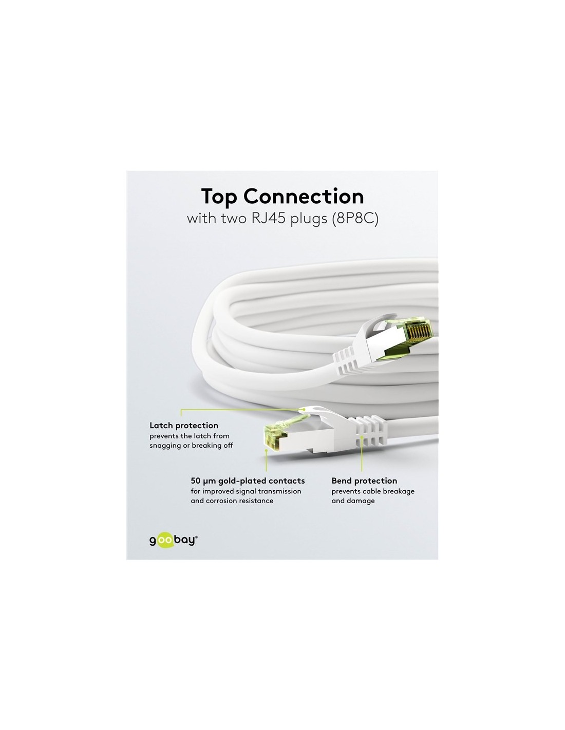 - Ensamblado en ambos extremos con conectores RJ45 (8P8C) con superficies de contacto bañadas en oro de 50 μm y protección de pestillo.