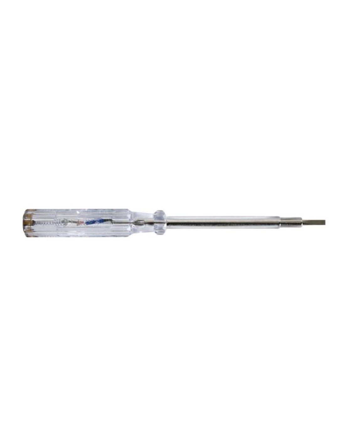 El comprobador está fabricado en acero al cromo-vanadio (CrV) duradero y cuenta con una carcasa transparente para una clara visibilidad de la indicación. Con una punta ranurada de 3,5 mm y una longitud de eje de 104 mm, el destornillador es compacto, práctico y adecuado para diversas tareas eléctricas.