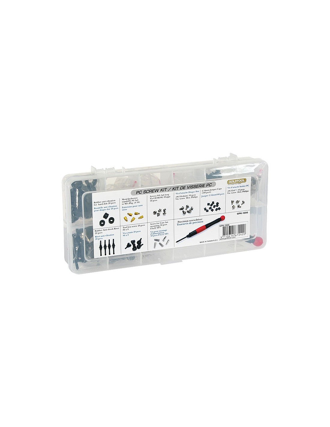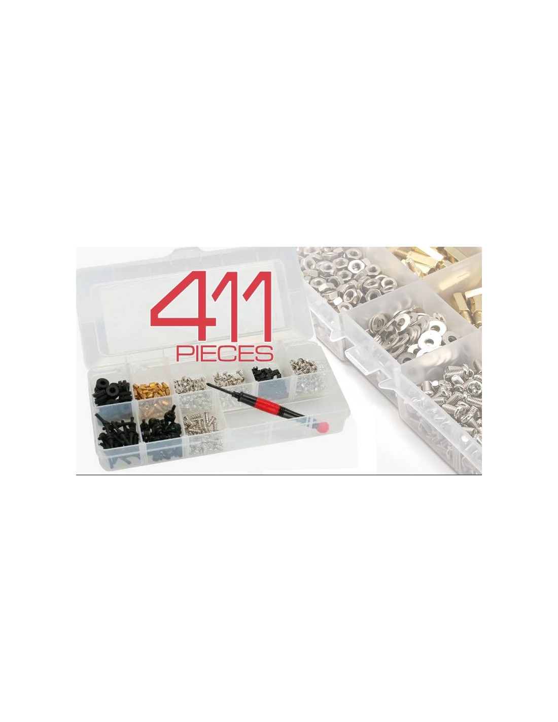 Juego de tornillos para ordenador con 411 piezas. Incluye tornillos antivibración para discos duros, tornillos para unidades ópticas y de disquetes, de caja, jumper, tornillos que no necesitan destornillador, para ventiladores de caja... Incluye también destornillador de precisión. Con maleta de transporte.