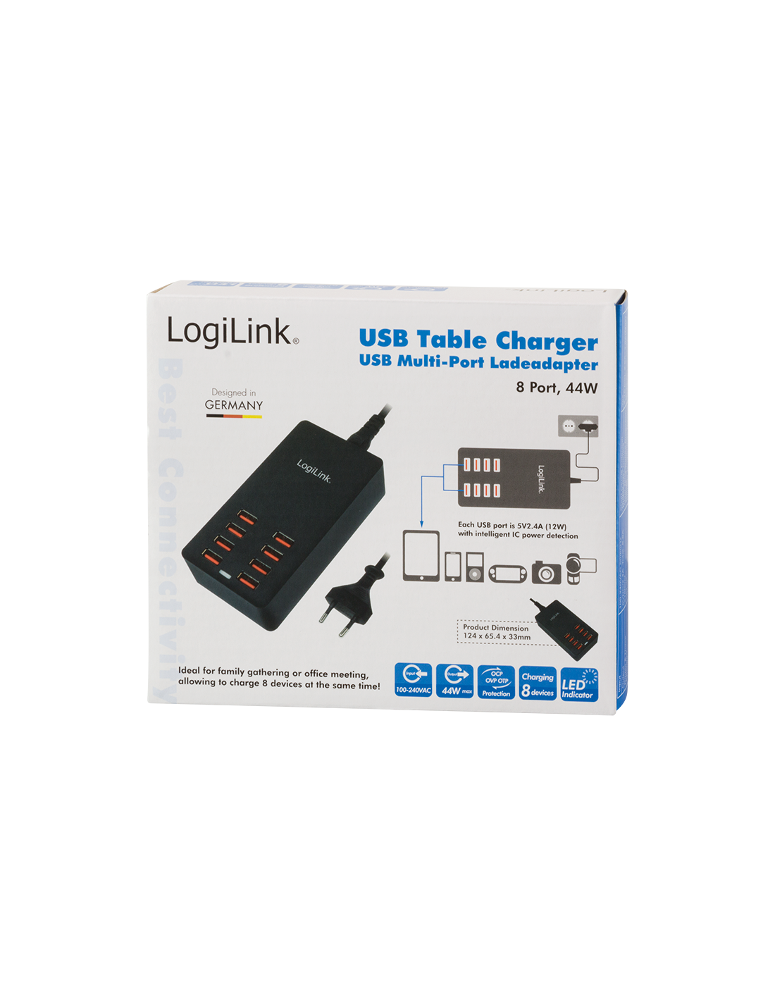 - Capaz de cargar 8 dispositivos al mismo tiempo