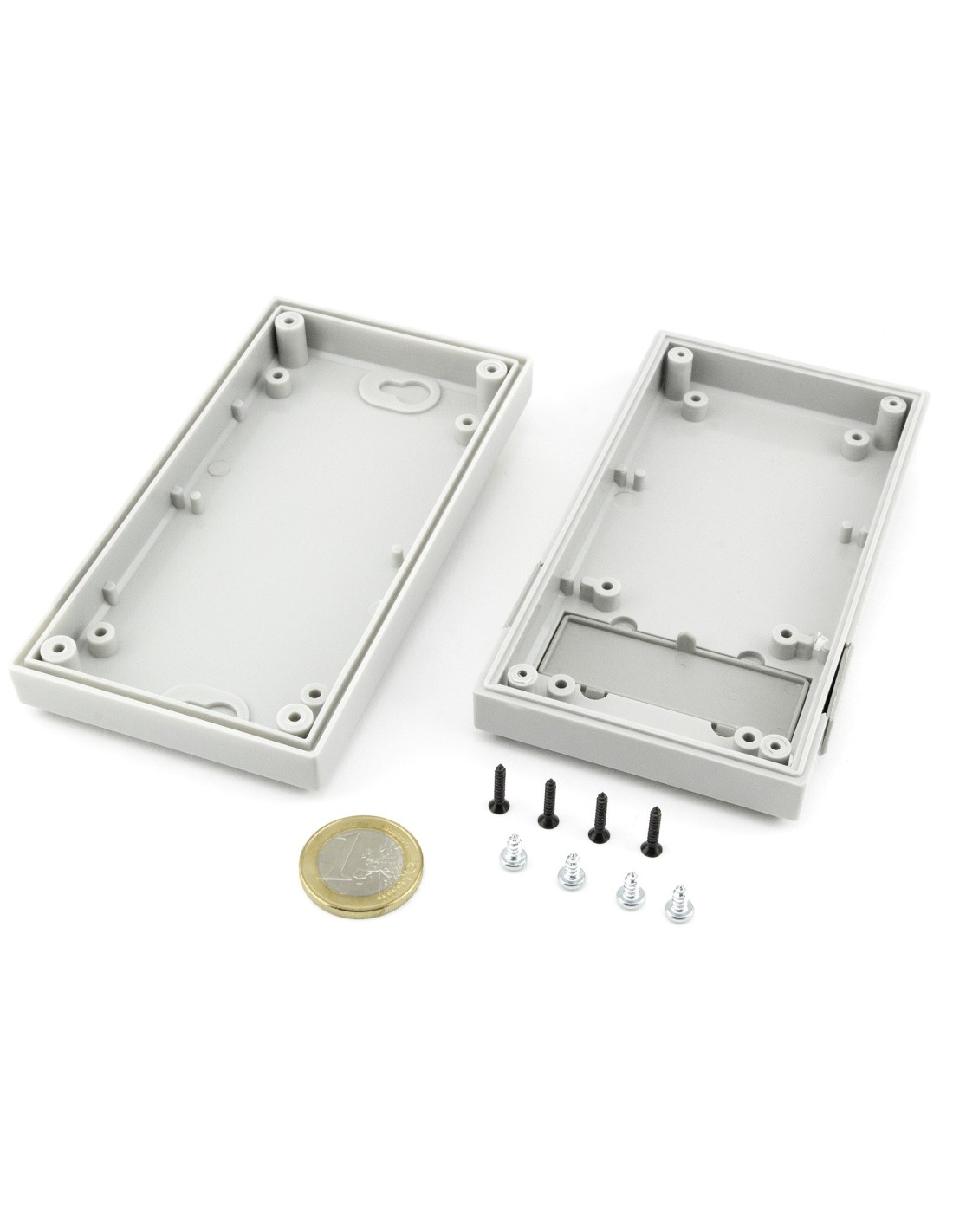 Modelo PP32, una caja fabricada en resistente ABS, este envolvente de esquinas biseladas, que consta de cuerpo, tapa y mirilla, posee unas dimensiones ideales para albergar un dispositivo de uso manual. Cada unidad incluye los tornillos de cierre y de sujeción del circuito. Está disponible en negro y gris (RAL7035).