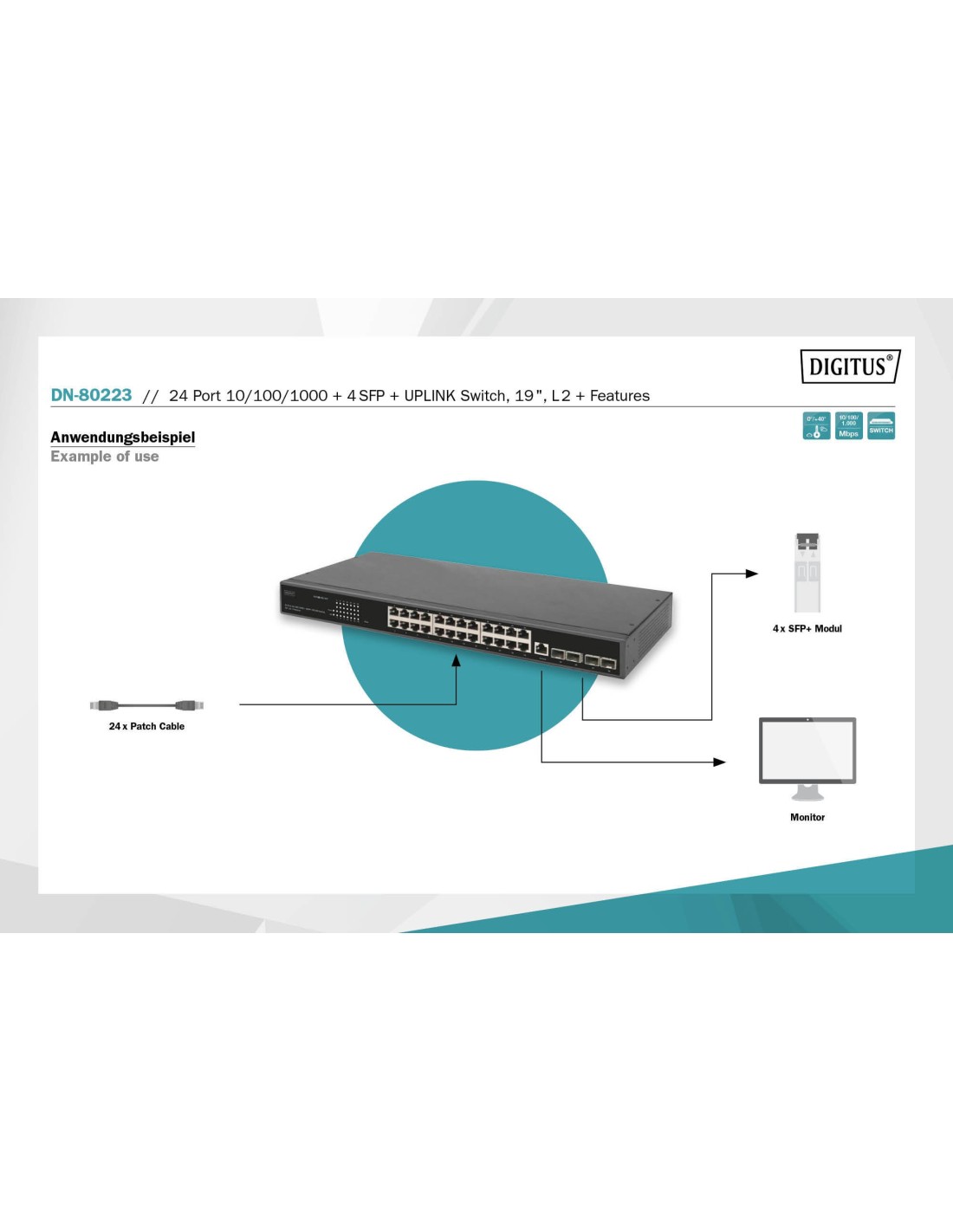 Con sus 24 puertos RJ45 Gigabit y cuatro ranuras de ampliación para módulos de fibra óptica SFP + independientes, el modelo Digitus DN-80223 es óptimo para conectar redes locales a centros de datos. Está equipado con 4 ranuras 10G SFP+ para la ampliación flexible de su red. El conmutador 10G Uplink ofrece un alto rendimiento, Enterprise Qos, directivas de seguridad ampliadas y amplias funciones de gestión de Layer-2+. Con todas estas funciones avanzadas, el conmutador es suficientemente potente y flexible para cumplir prácticamente todas las exigencias en el ámbito de la TI.