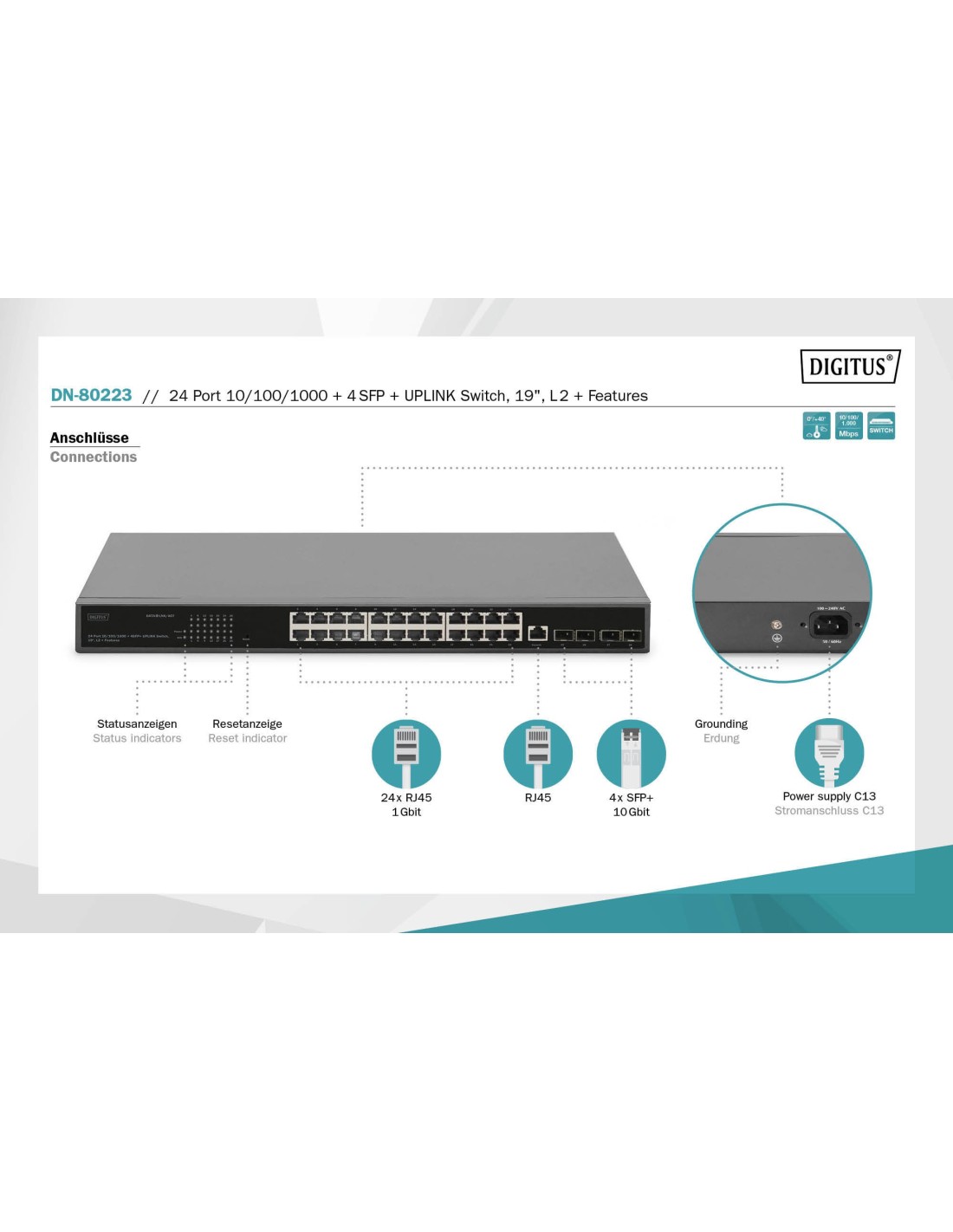14 días de devoluciónDIGITUS Conmutador de 24 puertos 10/100/1000 + 4SFP+ UPLINK, 19", características L2+