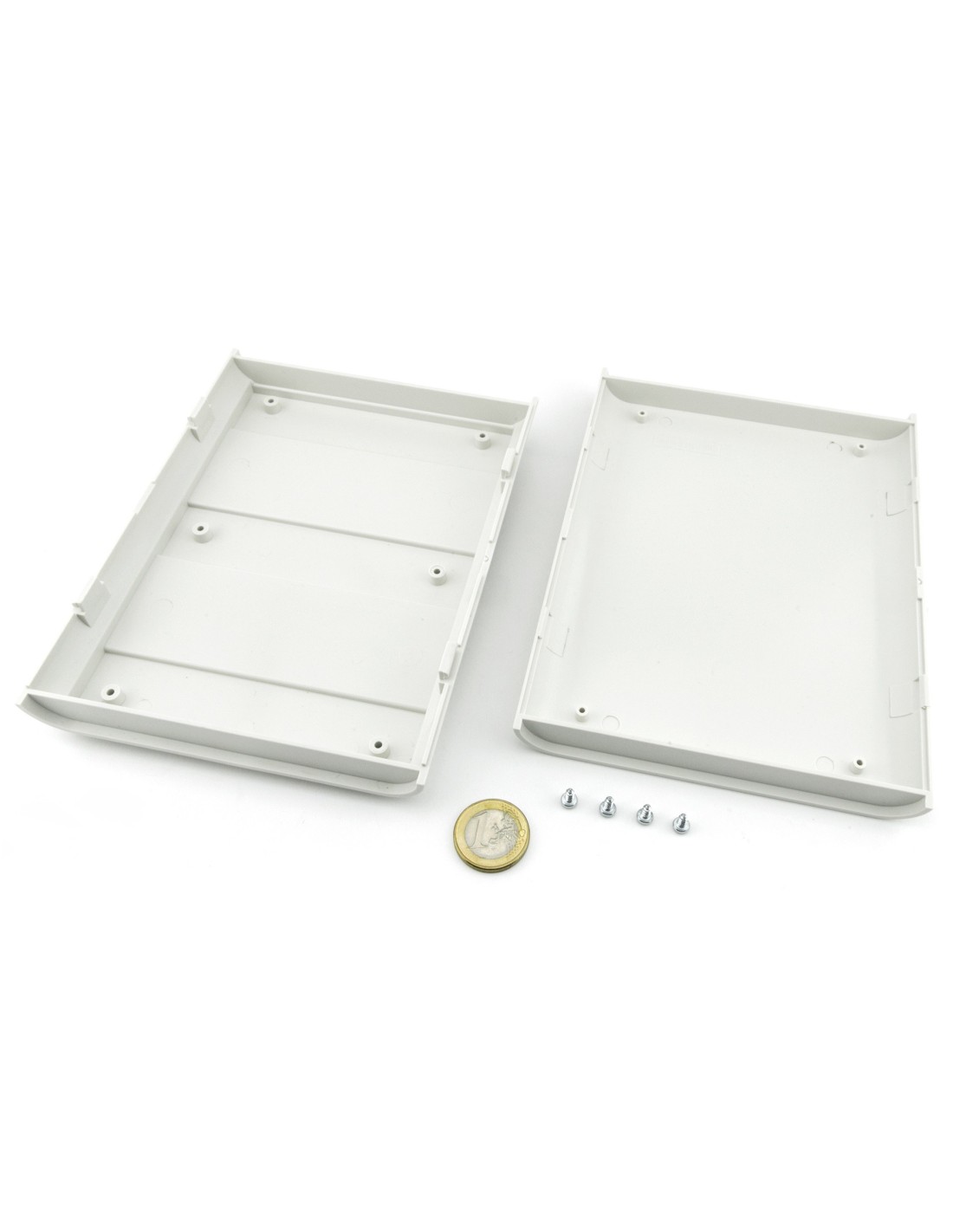 Modelo PP107, una caja fabricada en resistente ABS, este envolvente de aspecto ovalado y elegante simplicidad es ideal para dispositivos de sobremesa de mediano tamaño. Dispone de base sobre la que se apoya y consta de 2 piezas, cuerpo y tapa, ensambladas a presión. Disponible en negro o gris.