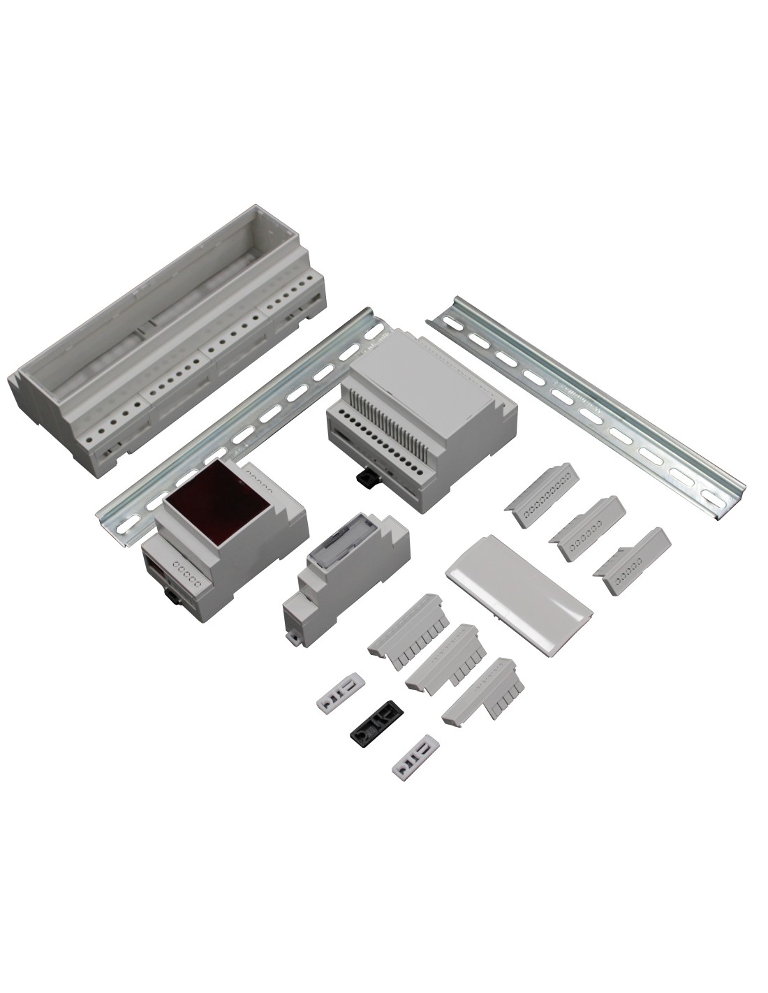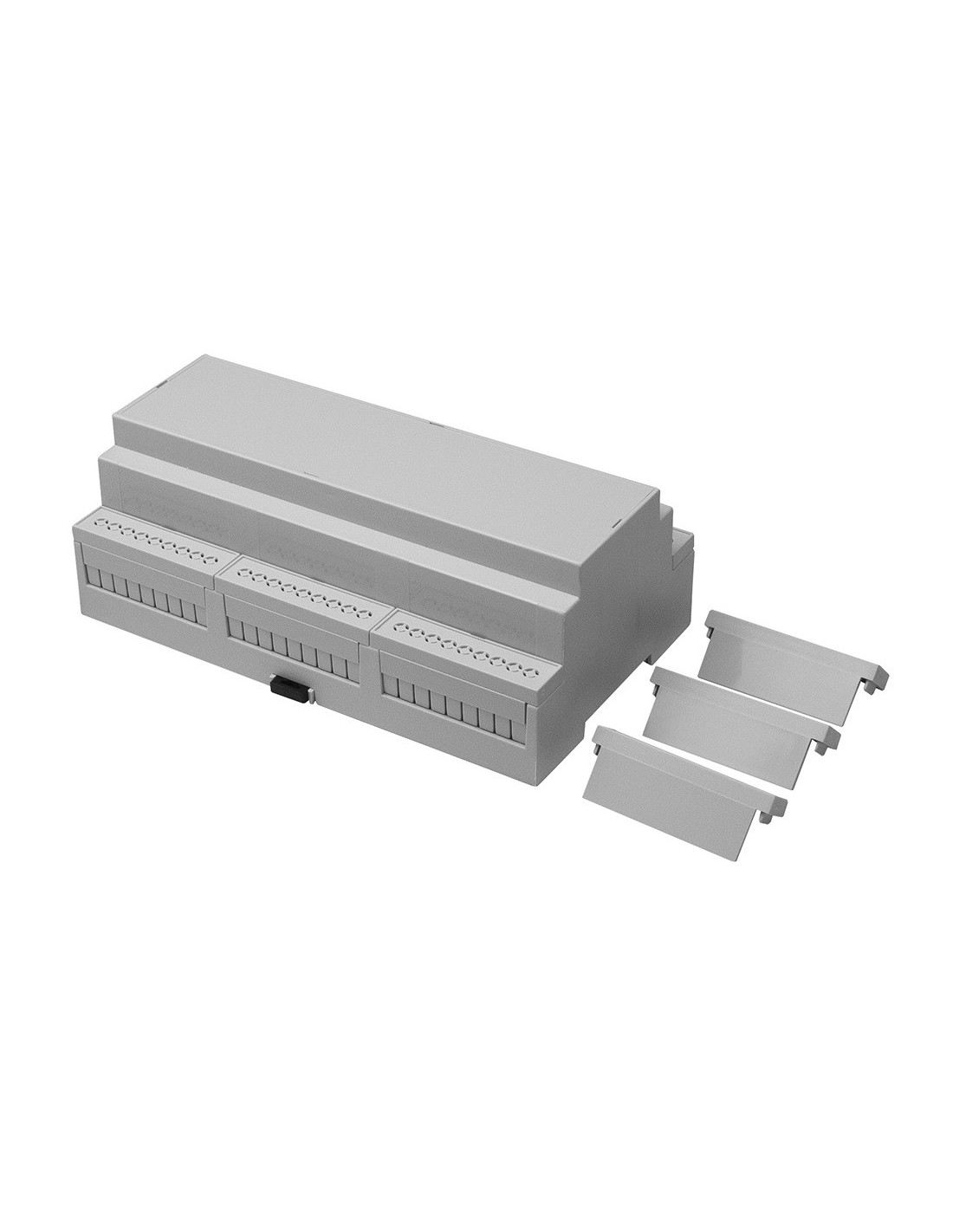CNMB Gabinete modular de riel DIN, kit de caja de módulo de altura estándar, tamaño 4, parte superior abierta, ambos lados abiertos. Esta carcasa fabricada en el Reino Unido está moldeada en policarbonato UL94-V0.