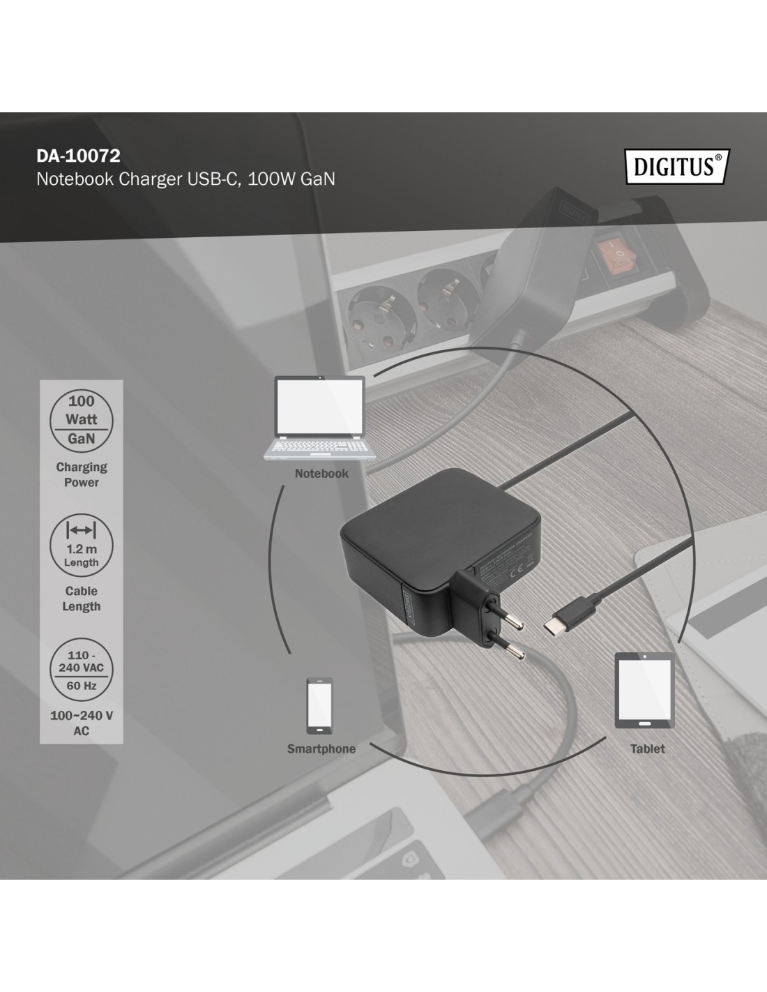 El cargador de portátil DIGITUS con conexión USB-C y tecnología GaN de 100 W es potente, compacto y ligero. Es compatible con la mayoría de los modelos de portátiles y muchos otros dispositivos USB-C y es ideal como segunda fuente de alimentación para la oficina, cuando viaja o en casa. Gracias a la tecnología GaN, el cargador es extremadamente eficiente y carga tus dispositivos más rápido que los cargadores convencionales, además está equipado con un sistema de protección inteligente que evita el sobrecalentamiento, la sobrecarga y los cortocircuitos, protegiendo así tus dispositivos.