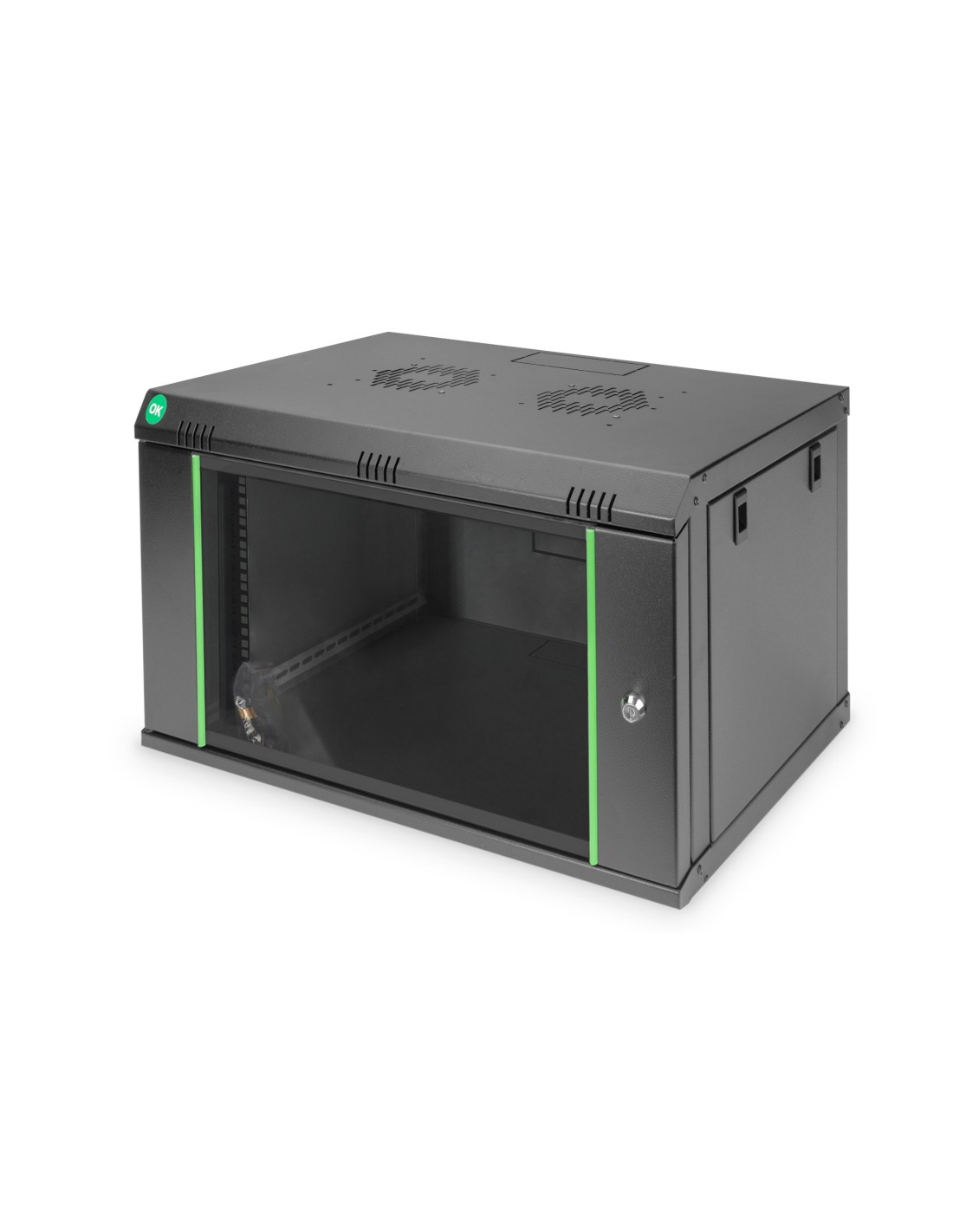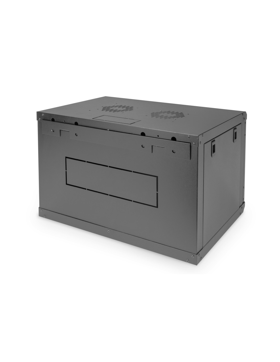 Los armarios de red para el montaje en la pared de la serie Dynamic han sido desarrollados para la ampliación sencilla y especialmente económica de redes. El techo, la base y la pared trasera de cada armario poseen una entrada para cables pretroquelada. Para el alojamiento de un módulo ventilador se incluye además una zona troquelada en el chasis de techo. En el interior están instalados dos pares de guías de perfil de 483 mm (19") galvanizadas y rotuladas con unidades de altura legibles desde ambos lados. Estas se pueden ajustar en profundidad. Cada armario es una robusta construcción de acero, hecha de chapa de acero con un grosor de hasta 1,5 mm. El proceso de pintado se realiza en forma de un recubrimiento de polvo electrostático en los colores estándar gris (RAL 7035) y negro (RAL 9005). Las paredes laterales desmontables y la puerta frontal desmontable y con cerradura facilitan el acceso. Es posible cambiar de lado las bisagras de las puertas. El montaje en la pared se realiza en dos pasos sencillos: La chapa de montaje se atornilla en la pared y se conecta después con la carcasa.