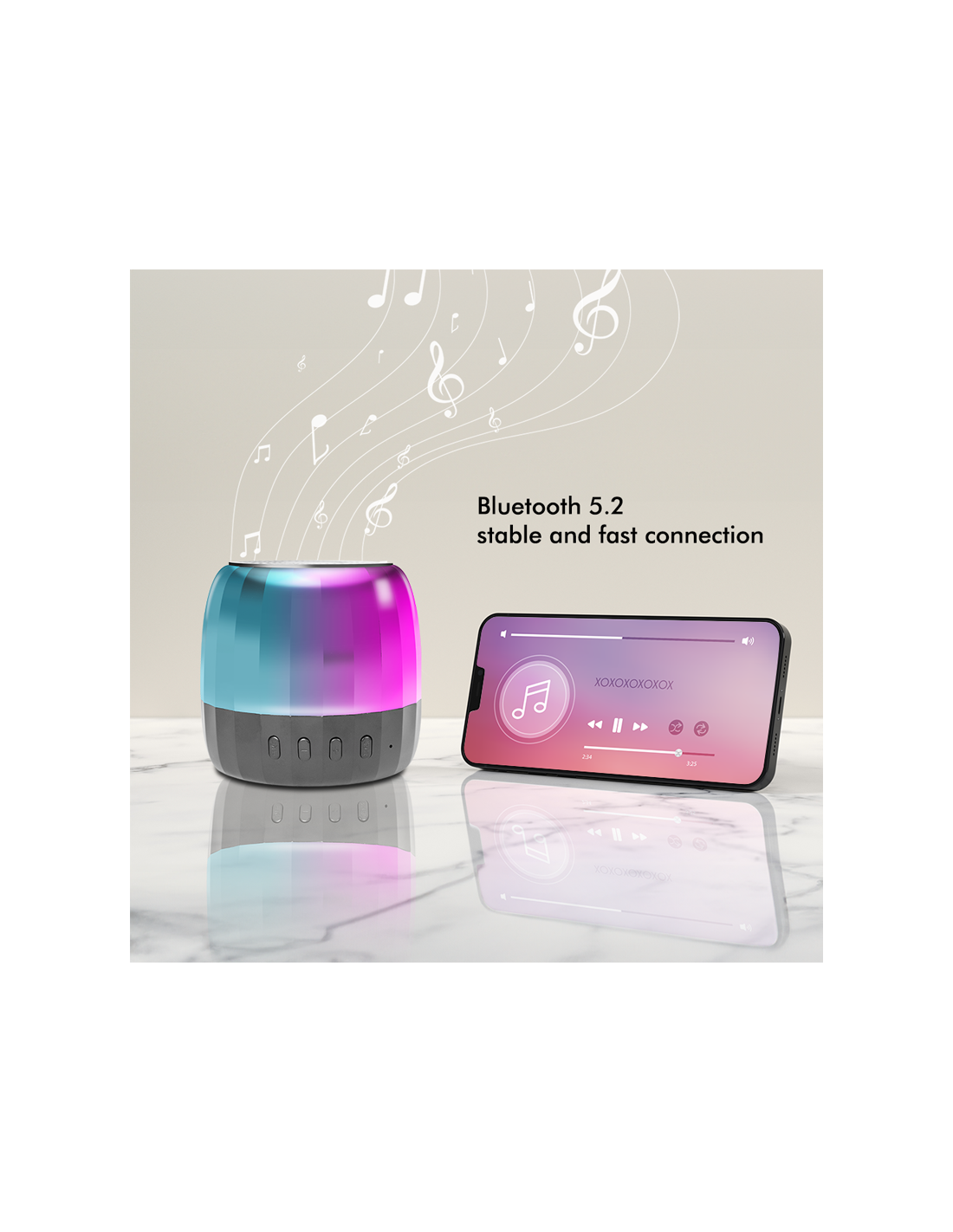 Potente altavoz Bluetooth TWS con control intuitivo te proporciona un sonido claro y potente, una conexión múltiple rápida y estable gracias a Bluetooth 5.2 con dos altavoces simultáneamente. La función manos libres integrada le permite atender llamadas sin tener que levantar el teléfono inteligente y la luz parcial garantiza el nivel adecuado de silencio.