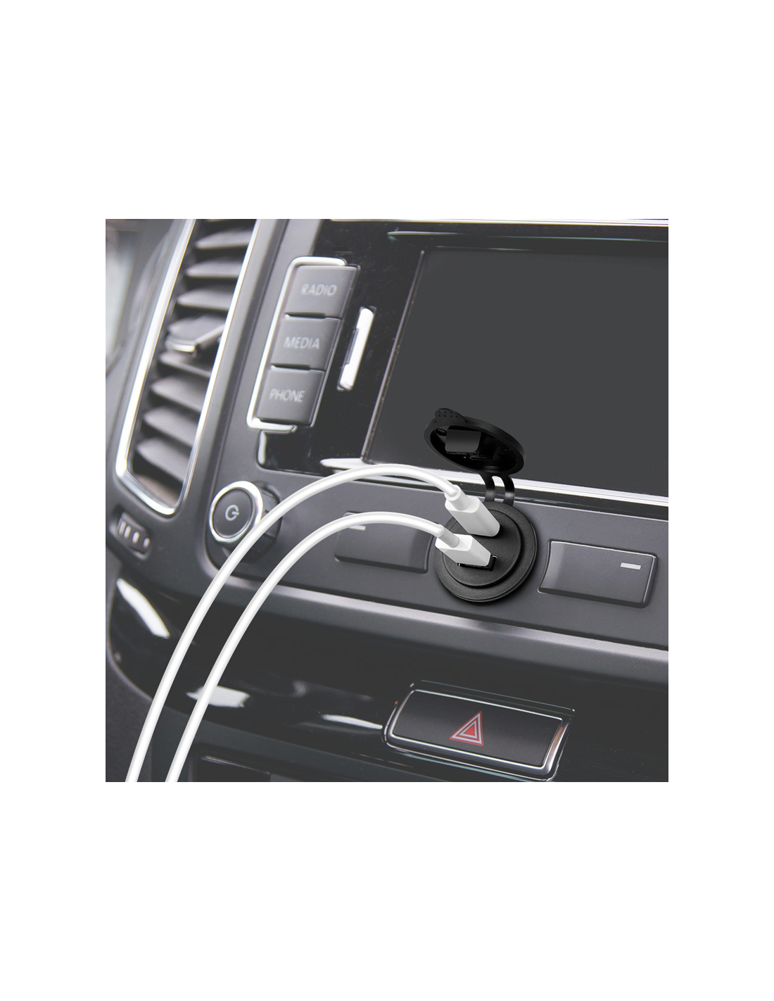 - Adaptador de carga dual integrado para coche para instalación fija con función de carga rápida