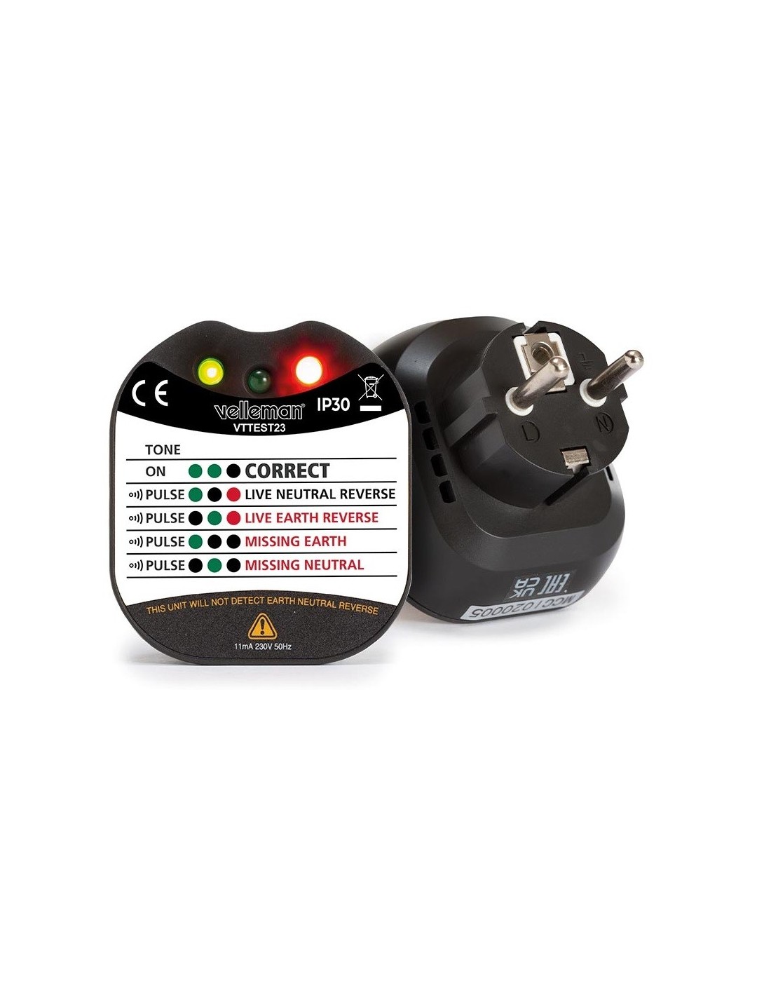 El probador de socket es su portero virtual que inmediatamente detecta errores en el cableado. Los cables invertidos o los cortes en la instalación pertenecen al pasado. El estado se muestra a través de LED y señales de sonido. Si el cableado es perfecto, todos los LED se iluminan de color verde y son unidos de tono continuo tranquilizador. Tan pronto como se detecta un error potencialmente peligroso, el probador activa una señal de alerta pulsada.