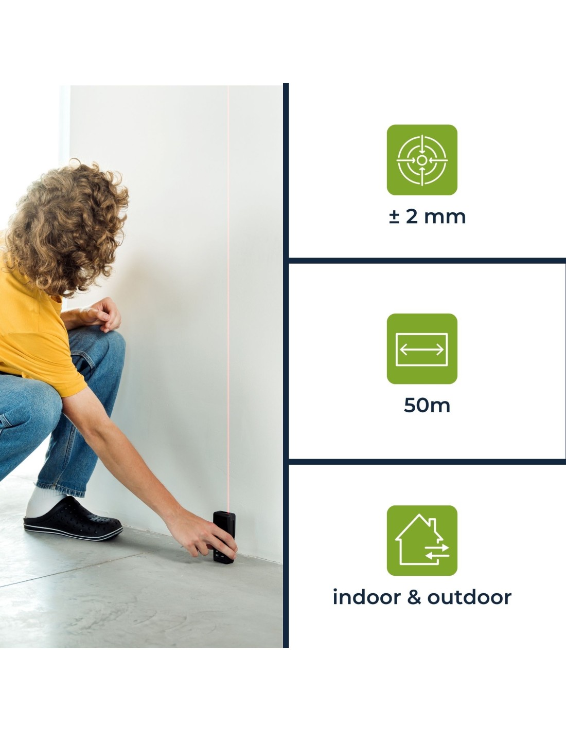 Gracias a este distanciómetro láser digital, cada detalle se muestra con una precisión de 1 mm, en un impresionante rango de 0,05 a 50 metros. El medidor, seguro de usar, ofrece varias funciones, como medición de superficie, volumen y altura, además de medición continua para mayor flexibilidad en el lugar de trabajo. Su robusto diseño cuenta con la certificación IP54, por lo que está preparado para cualquier trabajo en interiores y exteriores, con el apoyo de una batería de larga duración de 5000 a 8000 mediciones.