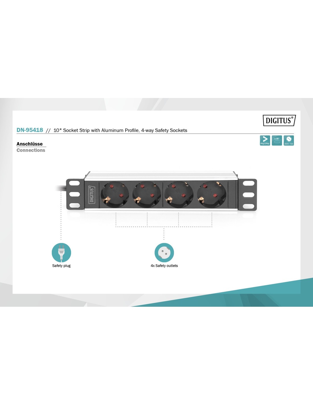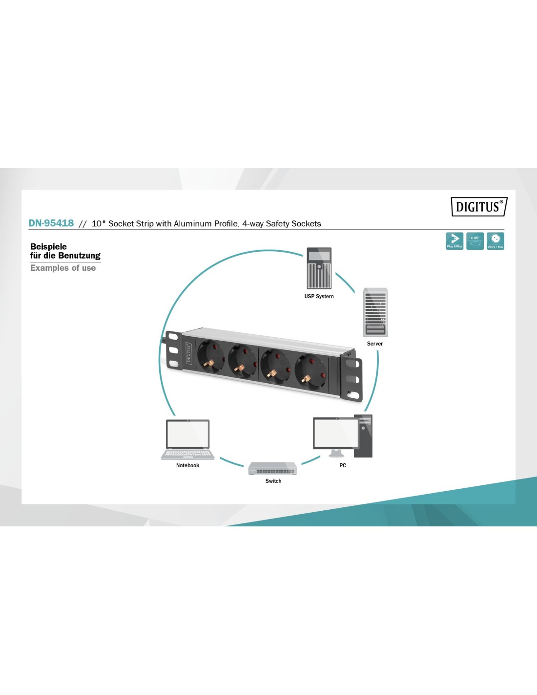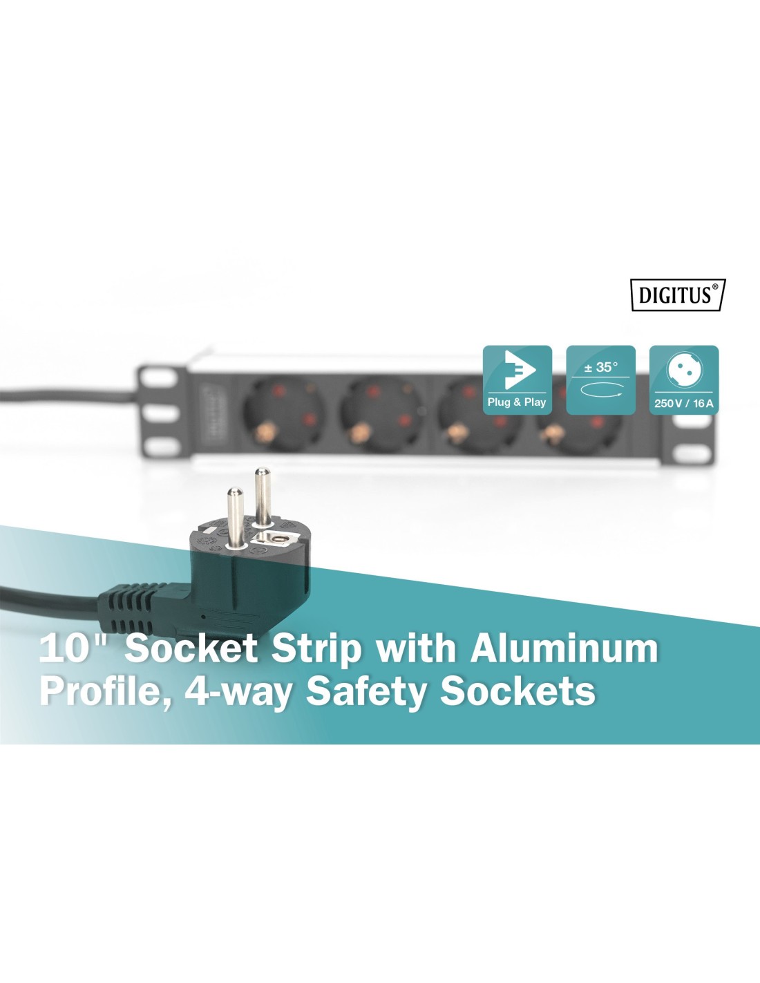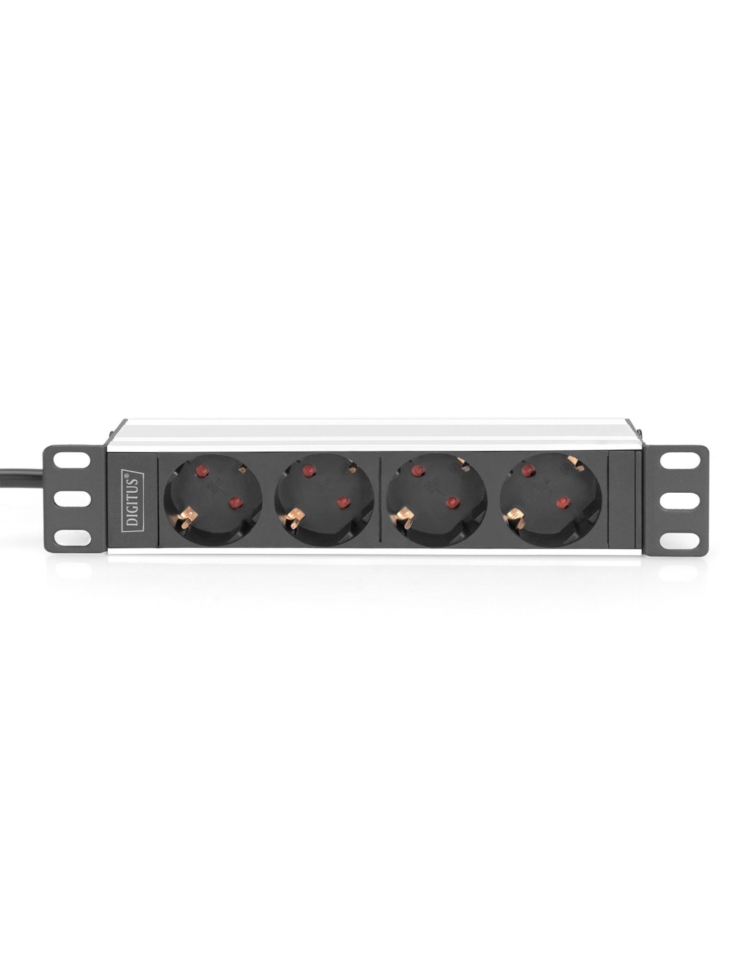 La regleta de 4 enchufes de DIGITUS® es la solución perfecta para su armario de red o de servidores de 10". Optimizadas para el montaje en el armario, las regletas de enchufes DIGITUS® de 220-240 V con 50-60 Hz le ofrecen un rendimiento óptimo con una ocupación adecuada. El material de fijación de 10" incluido en el suministro asegura la fijación óptima en las guías de perfil de sus armarios. Cada regleta de enchufes se puede montar en sentido horizontal y vertical. Según el tipo de armario existe la posibilidad de fijar la regleta de enchufes con las tomas hacia arriba o hacia abajo.