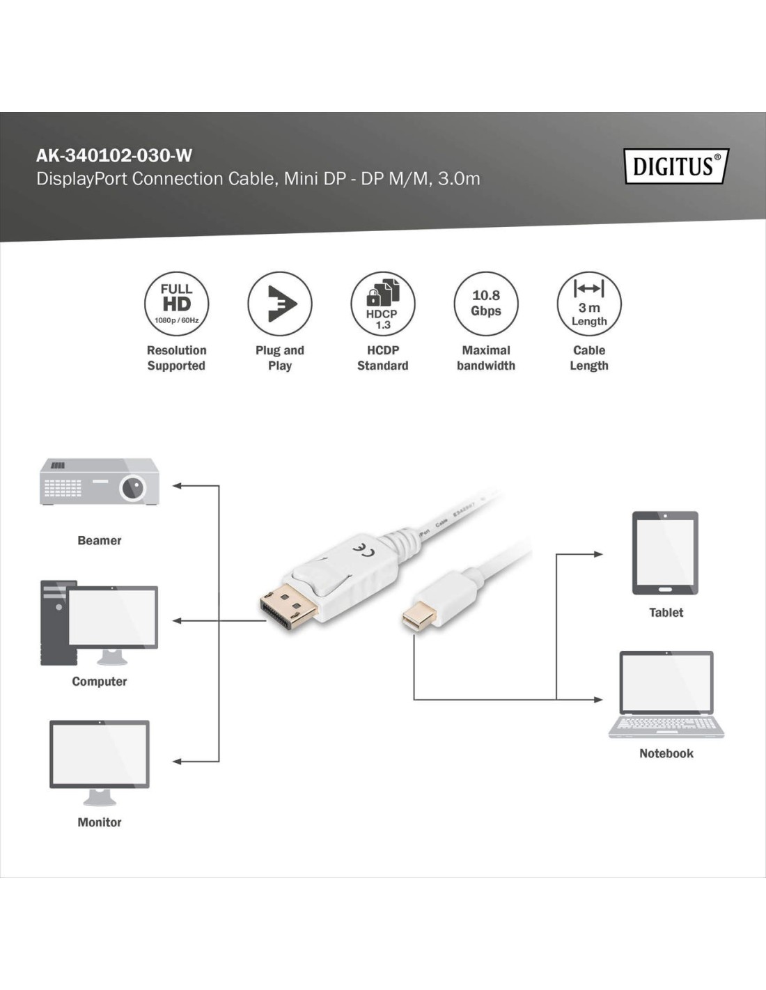 Este cable de alto rendimiento para vídeo en alta definición y audio digital es ideal para la conexión de un MacBook, MacBook Air, MacBook Pro, iMac, Mac mini o Mac Pro a un monitor, proyector o a un monitor LDC/TFT con interfaz DP, por ejemplo.