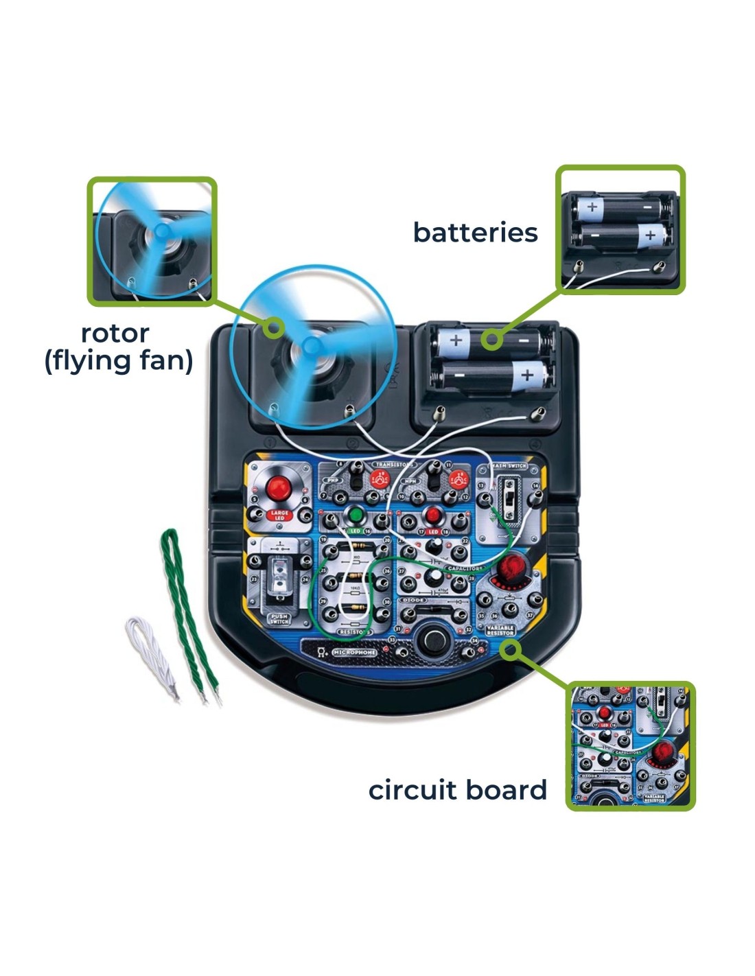 Este juego de interruptores electrónicos ofrece más de 18 experimentos y está ingeniosamente diseñado con una placa de circuito principal que contiene todos los componentes electrónicos necesarios. Todo lo que tiene que hacer es conectar los cables según las instrucciones de cada experimento y seguir los pasos cuidadosamente. Una vez que todo esté conectado, el circuito se activará y funcionará.